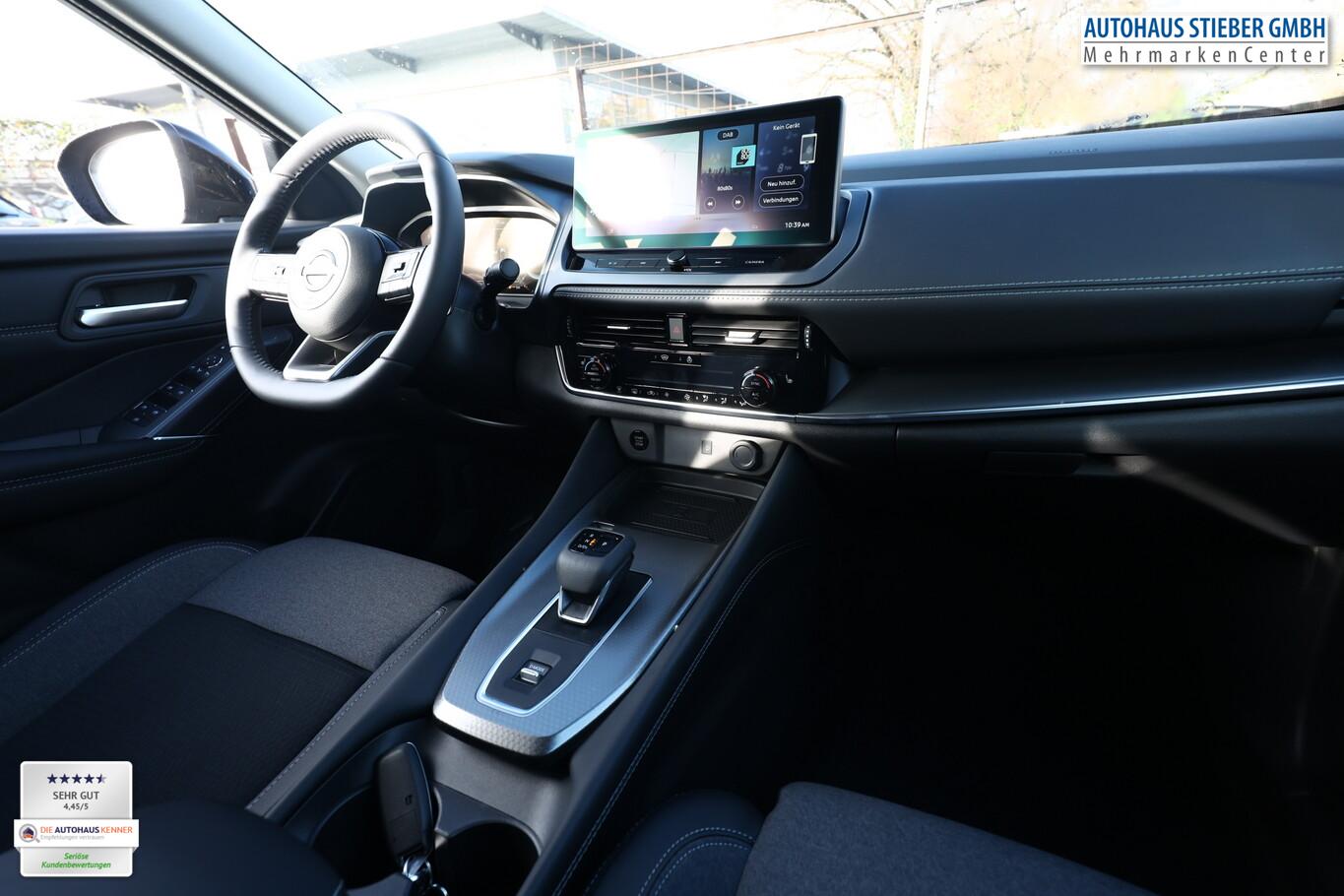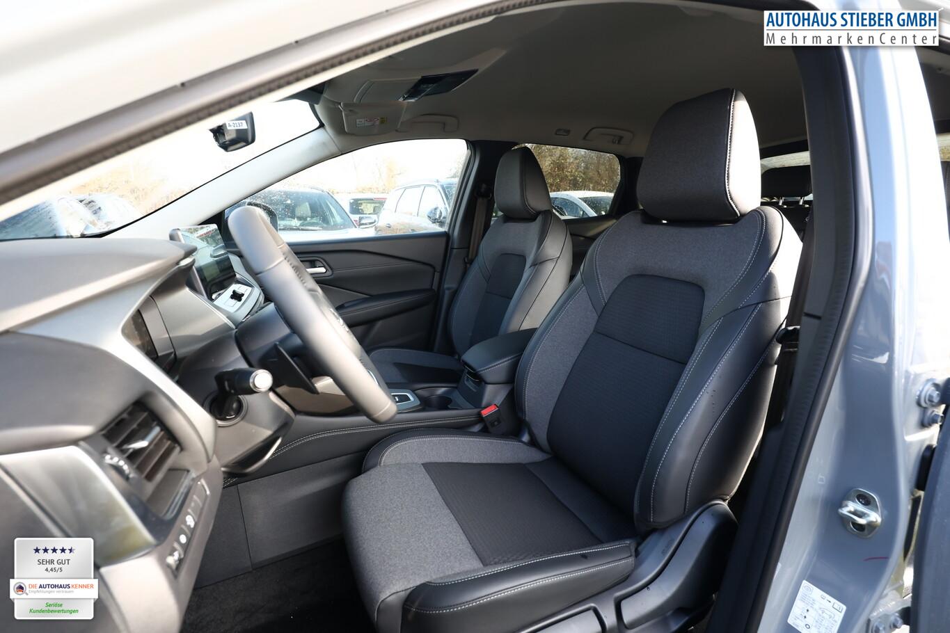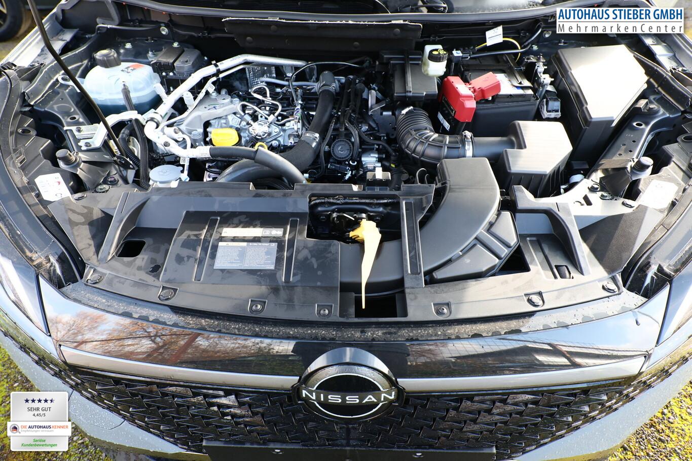 Winter-Paket (Lenkrad heizbar / Sitzheizung vorn / Frontscheibe heizbar), Dachreling silber, Brillenhalter, Einparkhilfe vorn und hinten, Fahrassistenz-System: ProPilot mit Navi-Link, Gurtwarnanlage, Induktionsladeschale für Smartphone, Innenspiegel rahmenlos mit Abblendautomatik, Kopf-Airbag vorn, LM-Felgen 18 Zoll, Navigation in Verbindung mit dem Smartphone (über Apple Carplay / Android Auto /...), Reifen 235/55 R18, Schadstoffarm nach Abgasnorm Euro 6e (EU6 EA), Sitze vorn manuell verstellbar, Multimedia-System Nissan Connect (6 Lautsprecher / Audiosystem / Smartphone kabellose Schnittstelle (Apple CarPlay & Android Auto) / Service-System: Google Services / Service-System: Nissan Connect Services), Schließ-/Startsystem intelligent key (Keyless-Entry / Start-Stop-Knopf), Lenkrad (Leder) mit Multifunktion (Audiobedienung am Lenkrad), Ambiente-Beleuchtung, Dachantenne im Haifischflossen-Design, Dachhimmel hellgrau, Elektr. Bremskraftverteilung (EBD), Gepäck-/Laderaum-Unterteilung (Flexi-Board), Geschwindigkeits-Begrenzeranlage, Instrumentenanzeige TFT-Farbdisplay (12,3 Zoll), Karosserie: 5-türig, Lendenwirbelstütze Sitz vorn links, elektr. verstellbar, Mild-Hybrid 116 kW (Motor 1,3 Ltr. - 116 kW DIG-T MHEV), Mittelarmlehne hinten mit Getränkehalter, Otto-Partikelfilter (OPF), Parkbremse elektrisch, Schalt-/Wählhebelgriff Leder, Sitz vorn links höhenverstellbar, Sitz vorn rechts höhenverstellbar, Sonnenblenden mit Spiegel (beleuchtet), Touchscreen-Farbdisplay (12,3 Zoll), Navigationssystem, USB-Anschluss im Fond, Anti-Blockier-System (ABS), Fahrassistenz-System: Moving Object Detection (MOD, Fußgängererkennung und bewegliche Objekterkennung), Antriebsart: Frontantrieb, Elektron. Stabilitäts-Programm (ESP), Getriebe Automatik stufenlos - X-Tronic-CVT, Klimaautomatik 2-Zonen, Airbag Fahrer-/Beifahrerseite, Fensterheber elektrisch vorn + hinten, Rücksitz geteilt/klappbar, Seitenairbag, Sitzbezug / Polsterung: Stoff/Kunstleder, Verglasung hinten abgedunkelt, Fahrmodusschalter, Around View Monitor (360° Umgebungsansicht), Auto-Hold-Funktion, Fahrassistenz-System: Auffahrwarnsystem (Forward Collision Warning, FCW), Fahrassistenz-System: Berganfahr-Assistent, Fahrassistenz-System: Verkehrszeichenerkennung, Geschwindigkeits-Regelanlage (Tempomat) mit Abstandsregelung, Fahrassistenz-System: Sicherheitssystem ERA GLONASS mit automatischem Notruf, Außenspiegel elektr. anklappbar, Außenspiegel elektr. verstell- und heizbar, Automatische Fahrlichtschaltung, Fahrassistenz-System: Fernlichtassistent, Fahrassistenz-System: Totwinkel-Assistent, Heckleuchten LED, Scheibenwischer mit Regensensor, Scheinwerfer LED, Tagfahrlicht LED, Fahrassistenz-System: aktiver Spurhalteassistent, mit korrigierendem Bremseingriff, Fahrassistenz-System: Autonomer Notbrems-Assistent, Fahrassistenz-System: Müdigkeitserkennungs-Sensor, Fahrassistenz-System: Querverkehrs-Assistent Heck (Rear Cross Traffic Alert, RCTA), Diebstahl-Warnanlage