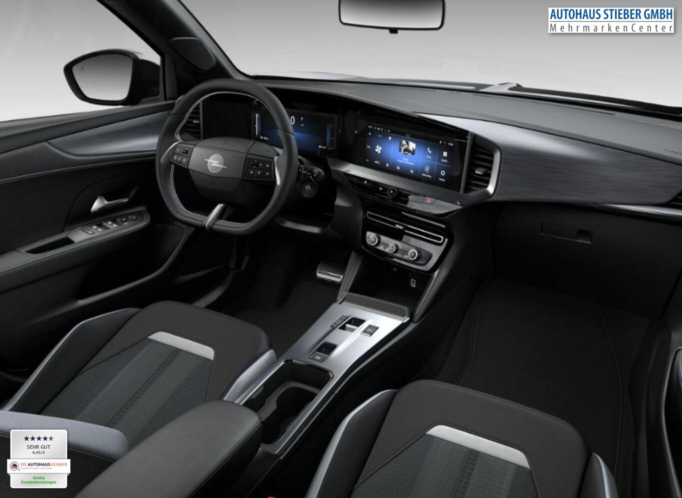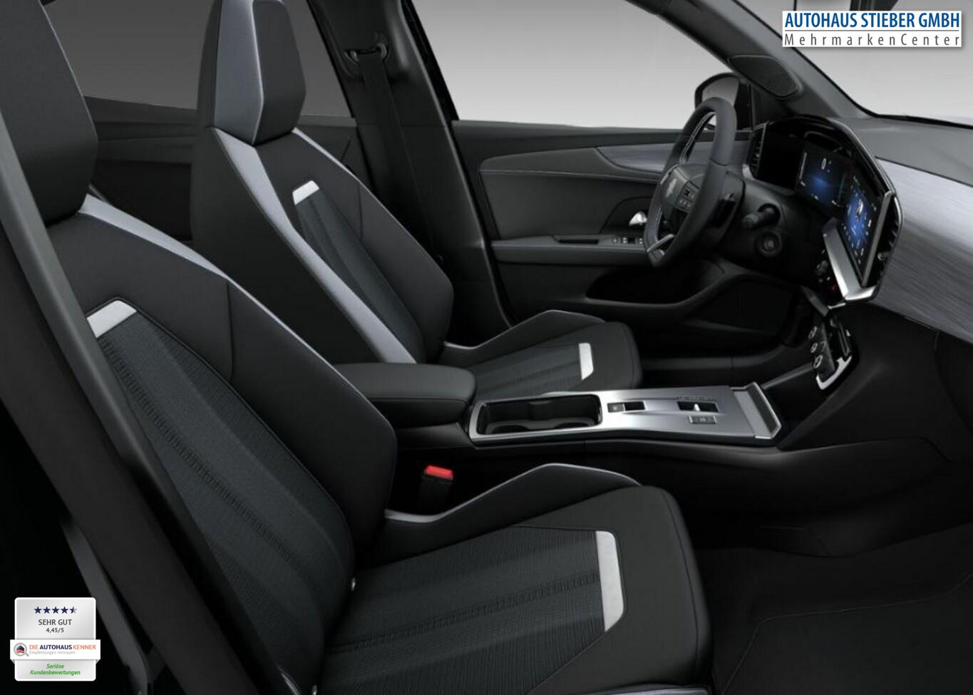 Komfort-Paket (Gepäck-/Laderaumboden doppelt / Lenkrad heizbar / Sonnenblenden mit Spiegel (beleuchtet) / Sitzheizung vorn / Lenkrad (Leder, vegan) mit Multifunktion), 10"-Touchscreen, Airbag Fahrer-/Beifahrerseite, Ambientebeleuchtung, Außenspiegel elektr. verstell- und heizbar, Fahrassistenz-System: aktiver Spurhalteassistent (Lane Assist), Fahrassistenz-System: Autonomer Notbremsassistent, Gepäcktaschen an Rückseite der Vordersitzlehnen, Geschwindigkeits-Regelanlage (Tempomat), Isofix-Aufnahmen für Kindersitz, Kindersicherung hinten, Kombiinstrument digital (10"), LM-Felgen 17", Mittelarmlehne vorn, Navigation in Verbindung mit dem Smartphone (über Apple Carplay / Android Auto /...), Pedalerie (Aluminium), Reifen 215/60 R17, Scheinwerfer LED adaptiv, Sitz vorn links und rechts verstellbar (6-fach), USB-Schnittstelle, Audiosystem Multimedia (6 Lautsprecher / Smartphone Schnittstelle (Apple CarPlay & Android Auto)), Black-Paket (Dach, Design-Ausführung (schwarz) / Kühlergrill, Opel Vizor, Rahmen in Hochglanz-Schwarz / Schriftzug Heckklappe Schwarz, Hochglanz), Sicht-Paket (Innenspiegel mit Abblendautomatik / Einschaltautomatik für Fahrlicht mit Tunnelerkennung / Scheibenwischer mit Regensensor), Parkpilotsystem hinten (Rückfahrkamera mit 180° Umgebungsansicht), Bluetooth Audio-Streaming, DAB-Tuner (Radioempfang digital), Dachhimmel schwarz, Fahrzeugschlüssel (2) beide klappbar, Karosserie: 5-türig, Motor 1,2 Ltr. - 96 kW, Otto-Partikelfilter (OPF), Radstand 2557 mm, Freisprecheinrichtung Bluetooth, Anti-Blockier-System (ABS), Antriebsart: Frontantrieb, Elektron. Stabilitäts-Programm Plus (ESP), Getriebe Automatik - mit Start-/Stop (8-Stufen), Klimaautomatik, Kopf-Airbag-System, Seitenairbag vorn, Sitzbezug / Polsterung: Stoff / Ledernachbildung, Wärmeschutzverglasung hinten abgedunkelt (Solar-Protect), Fahrassistenz-System: Verkehrszeichenerkennung, Fahrassistenz-System: Fernlichtassistent, Heckleuchten LED, Tagfahrlicht LED, Fahrassistenz-System: Müdigkeitserkennungs-Sensor