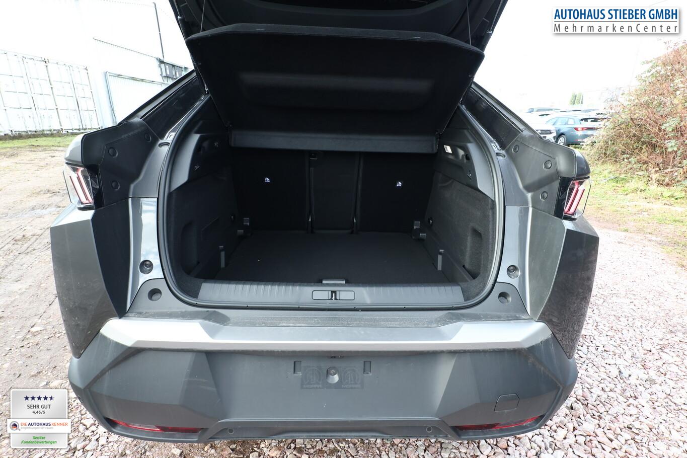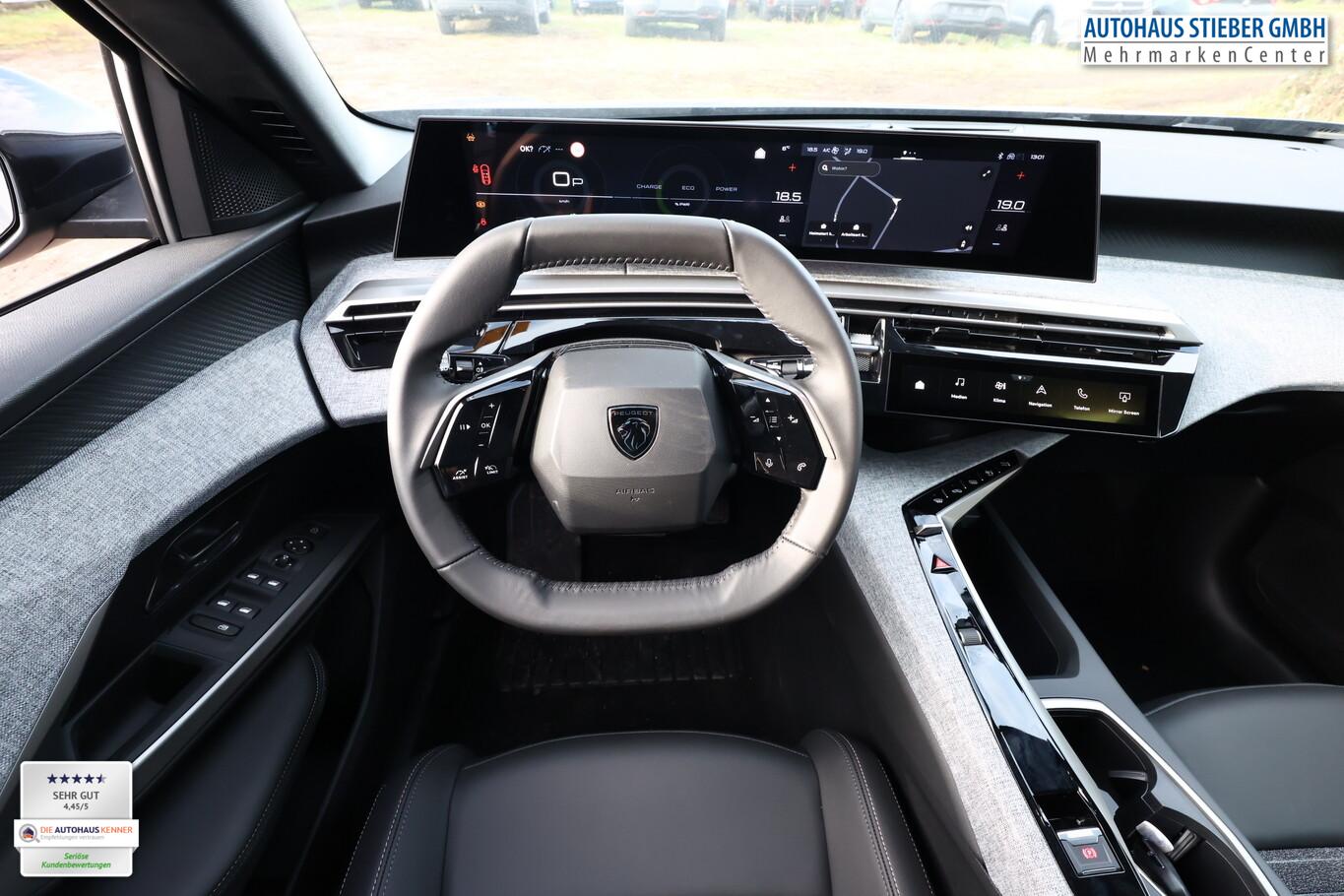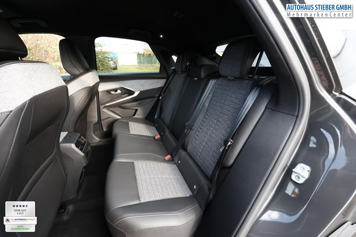 Drive-Assist-Paket (Lenkrad heizbar / Fahrassistenz-System: Autom. Distanzregelung (ACC inkl. Stop&Go-Funktion) / Rückfahrkamera mit 360° Umgebungsansicht / Fahrassistenz-System: Automatische Fahrlichtschaltung inkl. Fernlichtassistent / Fahrassistenz-System: Totwinkel-Assistent (SAM) / Einparkhilfe hinten / Einparkhilfe vorn und hinten / Fahrassistenz-System: Querverkehrs-Assistent Heck (Rear Cross Traffic Alert, RCTA) / Alarmanlage und Safesicherung), Panorama Navigations-Paket (Induktionsladeschale für Smartphone / Radioempfang digital (DAB+) / Freisprecheinrichtung Bluetooth / Navigationssystem i-Connect Advanced / USB-Anschluss (Typ C, 2-fach) / USB-Ladeanschlüsse (2) für 2.Sitzreihe / Audiobedienung am Lenkrad), Winter-Paket (Gepäckraum-Abtrennung (Netz) / Grip-Control / LM-Felgen 8x19 (Lulea, zweifarbig) / Frontscheibe heizbar / Fahrassistenz-System: Bergabfahrhilfe), 21 Zoll HD-Panorama I-Cockpit-Display, 6 Lautsprecher, 9,7 Zoll anpassbares virtuelles i-Toggle-Display, Allwetterbereifung, Beifahrersitz verstellbar (6-fach), Elektrische Fensterheber vorne und hinten mit Einklemmschutz, Fahrersitz AGR mit pneumatischer Lendenwirbelstütze, Fußraumbeleuchtung LED, Kabellose Smartphone Schnittstelle (Apple CarPlay & Android Auto), LED Leseleuchten vorn und hinten, Lenkrad (Leder) mit Multifunktion, Reifen 225/55 R19, Reifenreparaturkit, Sitzbezug / Polsterung: Stoff/Kunstleder (Innenausstattung: Ziernähte farbig), Außenspiegel elektr. anklappbar (Außenspiegel anklappbar), Licht- und Regensensor (Scheibenwischer mit Regensensor), Anhängerkupplung Vorbereitung, Außenspiegel und Spiegelfuss in Perla-Nera-Schwarz, Dachhimmel schwarz, Elektr. Bremskraftverteilung, Fahrassistenz-System: Multikollisionsbremse (Multi Collision Brake), Gepäckraumboden verschiebbar, variabel, Getränkehalter vorn, Heckscheibe heizbar, Innenspiegel mit Abblendautomatik, Karosserie: 5-türig, Mild-Hybrid 107 kW (Motor 1,2 Ltr. - 100 kW), Otto-Partikelfilter (GPF), Parkbremse elektrisch, Radstand Standard, Anti-Blockier-System (ABS), Fahrassistenz-System: Aktiver Notbrems-Assistent (Active Safety Brake Plus), Antischlupfregelung (ASR), Antriebsart: Frontantrieb, Elektron. Stabilitäts-Programm (ESP, Bosch), Getriebe Automatik - Doppelkupplungsgetriebe (6-Stufen, Hybrid), Klimaautomatik, getrennt regelbar Fahrer-/Beifahrerseite, Airbag Beifahrerseite abschaltbar, Airbag Fahrer-/Beifahrerseite, Isofix-Aufnahmen für Kindersitz, Kopf-Airbag-System, Kopf-Airbag-System hinten, Mittelarmlehne vorn, Seitenairbag hinten, Seitenairbag vorn, Seitenscheiben hinten und Heckscheibe getönt, Sitzheizung vorn, Zentralverriegelung / Startanlage Keyless System, Fahrassistenz-System: Berganfahrhilfe, Fahrassistenz-System: Verkehrszeichenerkennung, Geschwindigkeits-Regelanlage (Tempomat) inkl. Geschwindigkeits-Begrenzeranlage, Peugeot Connect-Box / SOS-Taste (Notruf für Lokalisierung Fahrzeug), Servolenkung elektrisch, Außenspiegel elektr. verstell- und heizbar, beide, Einschaltautomatik für Fahrlicht, Heckleuchten Voll-LED, Scheinwerfer Eco-LED, Tagfahrlicht LED, Fahrassistenz-System: aktiver Spurassistent (Lenkunterstützung), Fahrassistenz-System: Müdigkeitserkennungs-Sensor, Reifendruck-Kontrollsystem