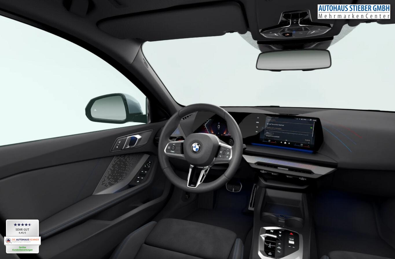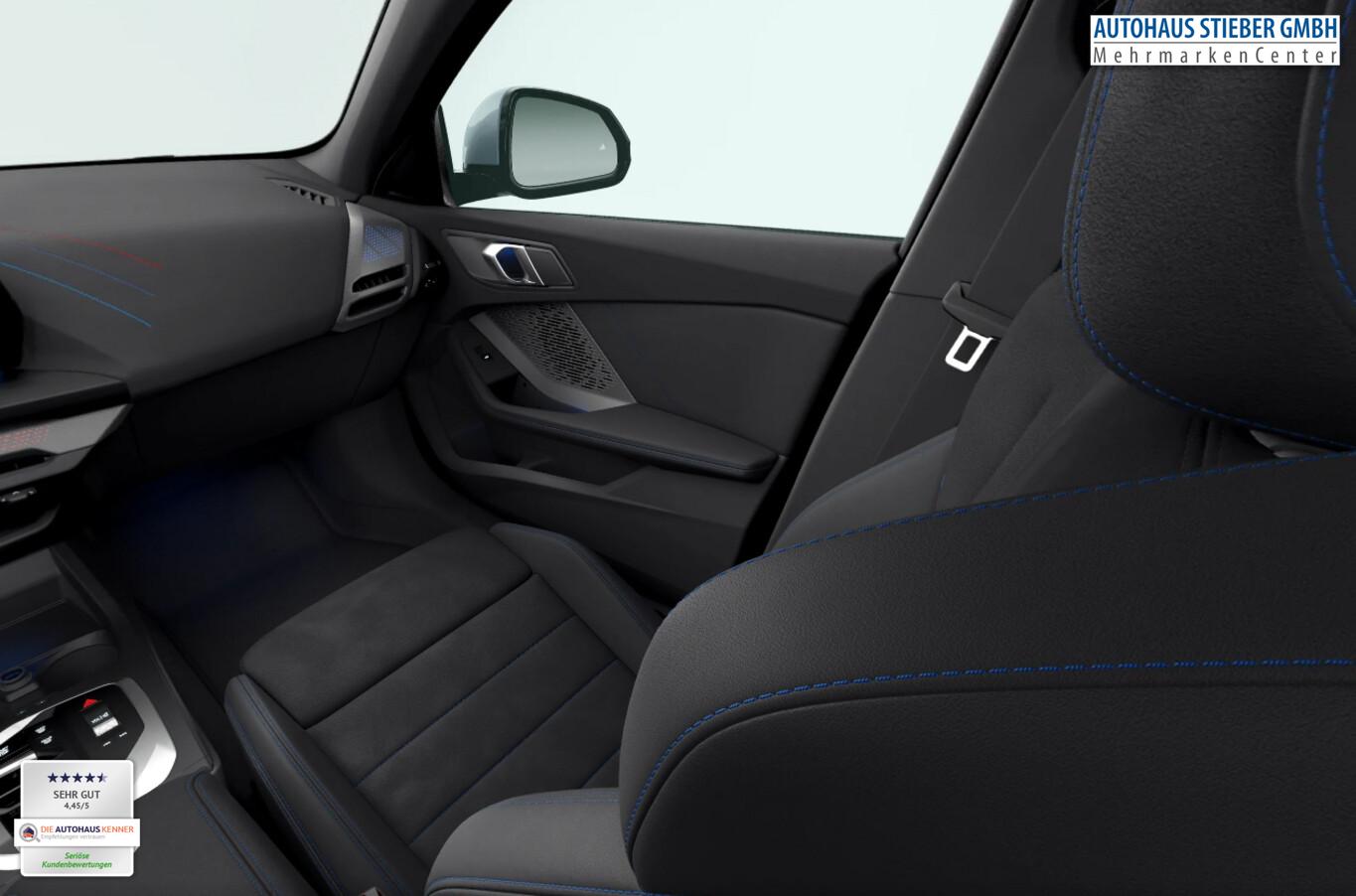 Panoramadach (Glas), Fahrassistenz-System: Driving Assistant Plus (Fahrassistenz-System: Verkehrszeichenerkennung mit Speed Limit-Assistent / Geschwindigkeits-Regelanlage, Aktiv mit Stop&Go-Funktion), Sonnenschutzverglasung (hinten abgedunkelt), LM-Felgen 8x18 (Y-Speiche 975, Bicolor, Midnight Grey, glanzgedreht), Außenspiegel anklappbar, Dachzierleisten in Wagenfarbe, Einstiegsleisten Aluminiumeinleger mit Schriftzug ,,M", Fahrassistenz-System: Ausstiegswarnung, Fahrassistenz-System: Ausweichassistent, Fahrassistenz-System: Linksabbiegewarnung mit Bremsfunktion, Fahrassistenz-System: Spurverlassenswarnung mit aktiver Rückführung, Fahrassistenz-System: Verkehrszeichenerkennung, Getränkehalter vorn, Instrumententafel mit Kontrastnähten, Intelligent Personal Assistant, Interieur Lichtpaket, M Interieurdekore Illuminated Aluminium Hexacube, matt, M Kennzeichnung an den Seiten, Navigationssystem, Pedalauflagen in Edelstahloptik, Reifen 225/45 R18, Schadstoffarm nach Abgasnorm Euro 6e (EU6 EA), Motor 1,5 Ltr. - 90 kW 12V KAT (Motor 1,5 Ltr. - 90 kW 12V), Parkassistent-Paket (Fahrassistenz-System: Anhängerassistent / Fahrassistenz-System: Parken Anfahrüberwachung / Fahrassistenz-System: Rückfahr-Assistent / Fahrassistenz-System: Rückfahrhilfe Notbremsfunktion (Active PDC) / Rückfahrkamera / Fahrassistenz-System: Park-Assistent), Fahrassistenz-System: Driving Assistant (Fahrassistenz-System: Heckaufprall-Vermeidung (Prävention Heckkollision) / Fahrassistenz-System: Querverkehrs-Assistent / Fahrassistenz-System: Spurwechsel-Warnsystem), Aktive Motorhaube, Außenausstattung: Shadow-Line Hochglanz, BMW Live Cockpit Plus, Dachhimmel Anthrazit, Geschwindigkeits-Begrenzeranlage (Speed Limit Device), Karosserie: 5-türig, M Sport, Parkbremse elektrisch, Personalisierungssystem (BMW My Modes), Personalisierungssystem (Personal eSIM), Radioempfang digital (DAB+), Service-System: Gesetzlicher Notruf, Sitzbezug / Polsterung: M Alcantara / Veganza Kombination (Schwarz mit blau Kontraststeppung), Multimedia-Schnittstelle 2 x USB (Typ C) Mittelkonsole vorn, Anti-Blockier-System (ABS), Bremsassistent, Fahrassistenz-System: Active Guard (Bremsassistent), Adaptives Fahrwerk M-Technic, Getriebe 7-Gang - Doppelkupplungsgetriebe mit Steptronic und Schaltwippen, Klimaautomatik, Airbag Beifahrerseite abschaltbar, Airbag Fahrer-/Beifahrerseite, Armauflage vorn, Fensterheber elektrisch, Isofix-Aufnahmen für Kindersitz an Beifahrersitz, Isofix-Aufnahmen für Kindersitz an Rücksitz, Sitzheizung vorn, Sportsitze vorn, Zentralverriegelung mit Fernbedienung, Geschwindigkeits-Regelanlage mit Bremsfunktion, Service-System: Intelligenter Notruf inkl. TeleServices, Lenkrad (Leder) mit Multifunktion M-Technic, Servolenkung Servotronic, Licht- und Regensensor, Lichtassistent (Follow me home), Scheinwerfer LED, Fahrassistenz-System: Aufmerksamkeits-Assistent, Fahrassistenz-System: Performance Control, Reifendruck-Kontrollsystem