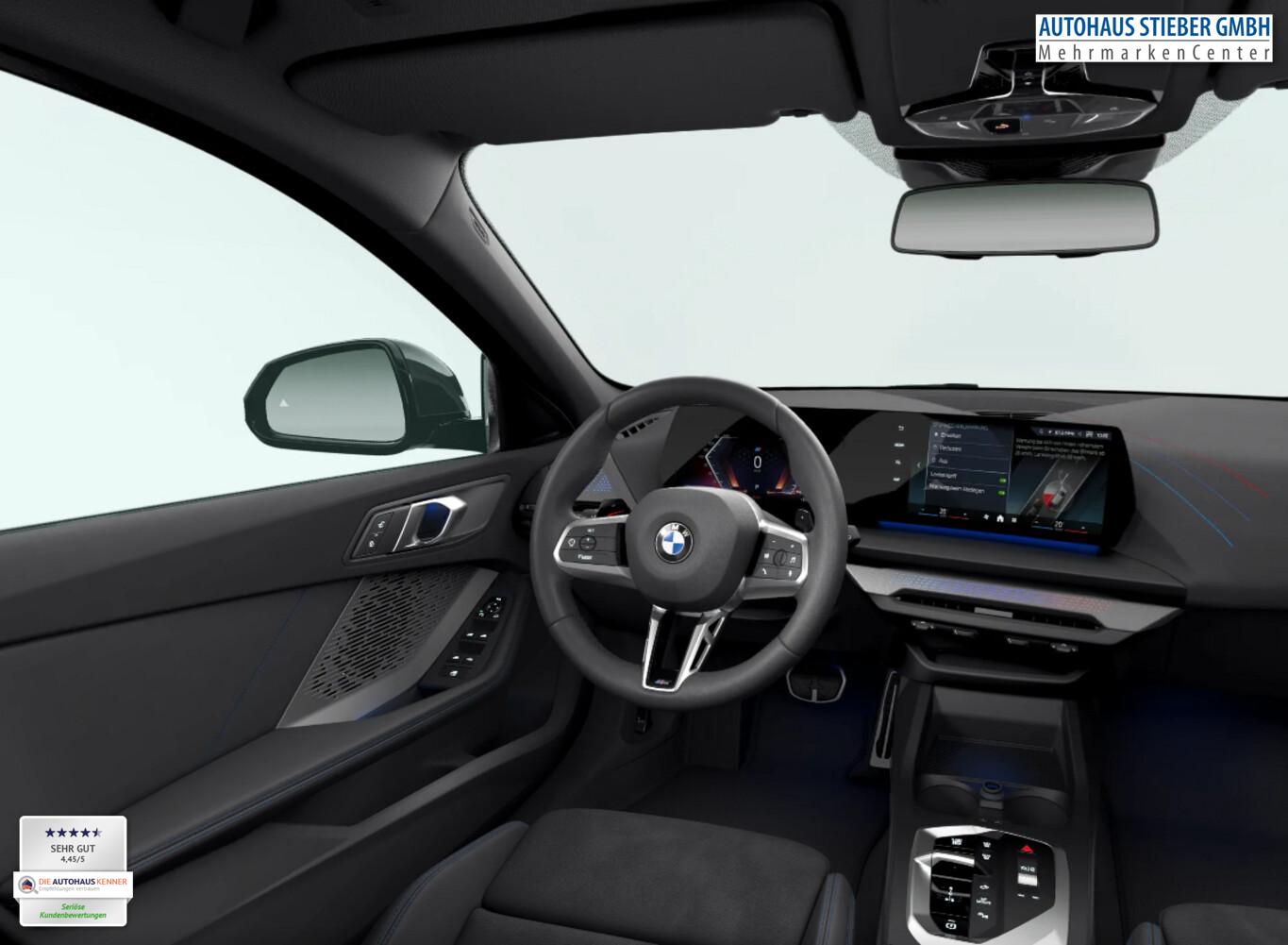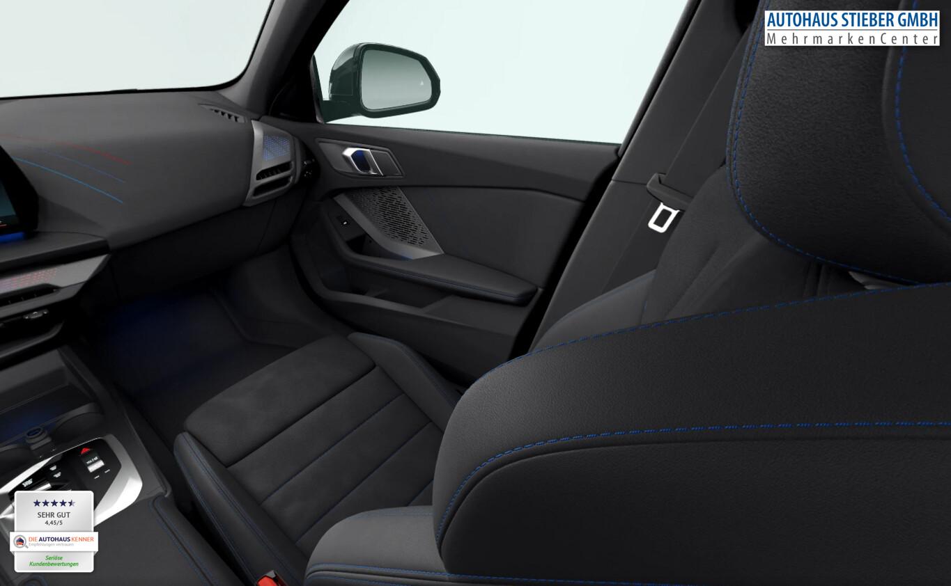 Panoramadach (Glas), Sonnenschutzverglasung (hinten abgedunkelt), LM-Felgen 8x18 (Y-Speiche 975, Bicolor, Midnight Grey, glanzgedreht), Außenspiegel anklappbar, Dachzierleisten in Wagenfarbe, Einstiegsleisten Aluminiumeinleger mit Schriftzug ,,M", Fahrassistenz-System: Ausstiegswarnung, Fahrassistenz-System: Ausweichassistent, Fahrassistenz-System: Linksabbiegewarnung mit Bremsfunktion, Fahrassistenz-System: Spurverlassenswarnung mit aktiver Rückführung, Fahrassistenz-System: Verkehrszeichenerkennung, Getränkehalter vorn, Instrumententafel mit Kontrastnähten, Intelligent Personal Assistant, Interieur Lichtpaket, M Interieurdekore Illuminated Aluminium Hexacube, matt, M Kennzeichnung an den Seiten, Navigationssystem, Pedalauflagen in Edelstahloptik, Reifen 225/45 R18, Schadstoffarm nach Abgasnorm Euro 6e (EU6 EA), Motor 1,5 Ltr. - 90 kW 12V KAT (Motor 1,5 Ltr. - 90 kW 12V), Parkassistent-Paket (Fahrassistenz-System: Anhängerassistent / Fahrassistenz-System: Parken Anfahrüberwachung / Fahrassistenz-System: Rückfahr-Assistent / Fahrassistenz-System: Rückfahrhilfe Notbremsfunktion (Active PDC) / Rückfahrkamera / Fahrassistenz-System: Park-Assistent), Fahrassistenz-System: Driving Assistant (Fahrassistenz-System: Heckaufprall-Vermeidung (Prävention Heckkollision) / Fahrassistenz-System: Querverkehrs-Assistent / Fahrassistenz-System: Spurwechsel-Warnsystem), Aktive Motorhaube, Außenausstattung: Shadow-Line Hochglanz, BMW Live Cockpit Plus, Dachhimmel Anthrazit, Geschwindigkeits-Begrenzeranlage (Speed Limit Device), Karosserie: 5-türig, M Sport, Parkbremse elektrisch, Personalisierungssystem (BMW My Modes), Personalisierungssystem (Personal eSIM), Radioempfang digital (DAB+), Service-System: Gesetzlicher Notruf, Sitzbezug / Polsterung: M Alcantara / Veganza Kombination (Schwarz mit blau Kontraststeppung), Multimedia-Schnittstelle 2 x USB (Typ C) Mittelkonsole vorn, Anti-Blockier-System (ABS), Bremsassistent, Fahrassistenz-System: Active Guard (Bremsassistent), Adaptives Fahrwerk M-Technic, Getriebe 7-Gang - Doppelkupplungsgetriebe mit Steptronic und Schaltwippen, Klimaautomatik, Airbag Beifahrerseite abschaltbar, Airbag Fahrer-/Beifahrerseite, Armauflage vorn, Fensterheber elektrisch, Isofix-Aufnahmen für Kindersitz an Beifahrersitz, Isofix-Aufnahmen für Kindersitz an Rücksitz, Sitzheizung vorn, Sportsitze vorn, Zentralverriegelung mit Fernbedienung, Geschwindigkeits-Regelanlage mit Bremsfunktion, Service-System: Intelligenter Notruf inkl. TeleServices, Lenkrad (Leder) mit Multifunktion M-Technic, Servolenkung Servotronic, Licht- und Regensensor, Lichtassistent (Follow me home), Scheinwerfer LED, Fahrassistenz-System: Aufmerksamkeits-Assistent, Fahrassistenz-System: Performance Control, Reifendruck-Kontrollsystem