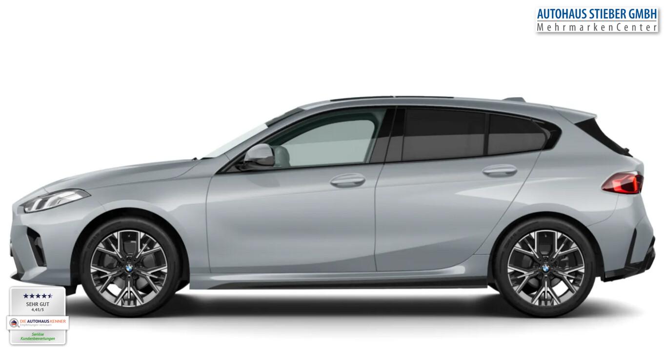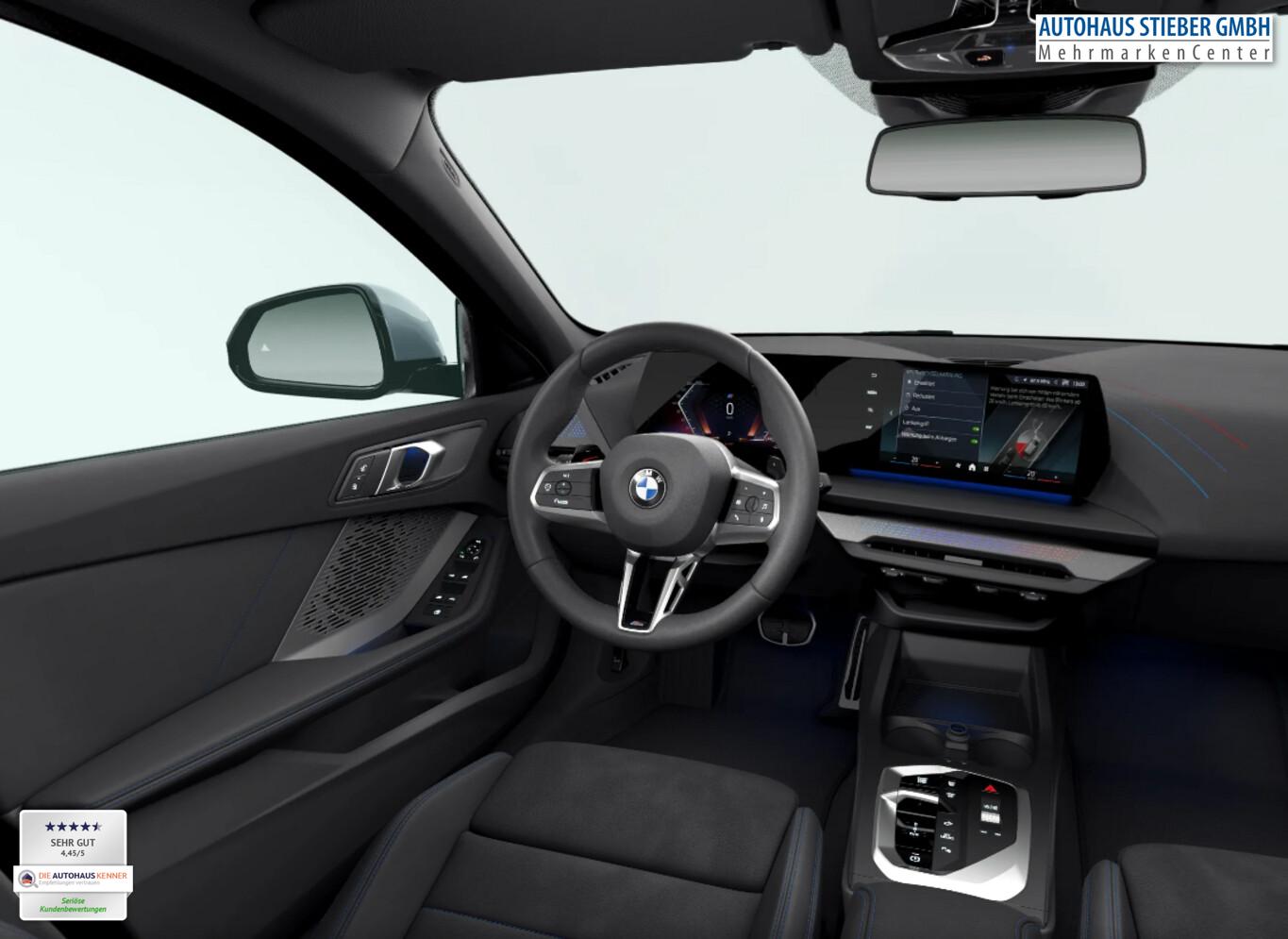 Panoramadach (Glas), Sonnenschutzverglasung (hinten abgedunkelt), LM-Felgen 8x18 (Y-Speiche 975, Bicolor, Midnight Grey, glanzgedreht), Außenspiegel anklappbar, Dachzierleisten in Wagenfarbe, Einstiegsleisten Aluminiumeinleger mit Schriftzug ,,M", Fahrassistenz-System: Ausstiegswarnung, Fahrassistenz-System: Ausweichassistent, Fahrassistenz-System: Linksabbiegewarnung mit Bremsfunktion, Fahrassistenz-System: Spurverlassenswarnung mit aktiver Rückführung, Fahrassistenz-System: Verkehrszeichenerkennung, Getränkehalter vorn, Instrumententafel mit Kontrastnähten, Intelligent Personal Assistant, Interieur Lichtpaket, M Interieurdekore Illuminated Aluminium Hexacube, matt, M Kennzeichnung an den Seiten, Navigationssystem, Pedalauflagen in Edelstahloptik, Reifen 225/45 R18, Schadstoffarm nach Abgasnorm Euro 6e (EU6 EA), Motor 1,5 Ltr. - 115 kW Mild-Hybrid (Mild-Hybrid 125 kW (Motor 1,5 Ltr. - 115 kW)), Parkassistent-Paket (Fahrassistenz-System: Anhängerassistent / Fahrassistenz-System: Parken Anfahrüberwachung / Fahrassistenz-System: Rückfahr-Assistent / Fahrassistenz-System: Rückfahrhilfe Notbremsfunktion (Active PDC) / Rückfahrkamera / Fahrassistenz-System: Park-Assistent), Fahrassistenz-System: Driving Assistant (Fahrassistenz-System: Heckaufprall-Vermeidung (Prävention Heckkollision) / Fahrassistenz-System: Querverkehrs-Assistent / Fahrassistenz-System: Spurwechsel-Warnsystem), Aktive Motorhaube, Außenausstattung: Shadow-Line Hochglanz, BMW Live Cockpit Plus, Dachhimmel Anthrazit, Geschwindigkeits-Begrenzeranlage (Speed Limit Device), Karosserie: 5-türig, M Sport, Parkbremse elektrisch, Personalisierungssystem (BMW My Modes), Personalisierungssystem (Personal eSIM), Radioempfang digital (DAB+), Service-System: Gesetzlicher Notruf, Sitzbezug / Polsterung: M Alcantara / Veganza Kombination (Schwarz mit blau Kontraststeppung), Multimedia-Schnittstelle 2 x USB (Typ C) Mittelkonsole vorn, Anti-Blockier-System (ABS), Bremsassistent, Fahrassistenz-System: Active Guard (Bremsassistent), Adaptives Fahrwerk M-Technic, Getriebe 7-Gang - Doppelkupplungsgetriebe mit Steptronic und Schaltwippen, Klimaautomatik, Airbag Beifahrerseite abschaltbar, Airbag Fahrer-/Beifahrerseite, Armauflage vorn, Fensterheber elektrisch, Isofix-Aufnahmen für Kindersitz an Beifahrersitz, Isofix-Aufnahmen für Kindersitz an Rücksitz, Sitzheizung vorn, Sportsitze vorn, Zentralverriegelung mit Fernbedienung, Geschwindigkeits-Regelanlage mit Bremsfunktion, Service-System: Intelligenter Notruf inkl. TeleServices, Lenkrad (Leder) mit Multifunktion M-Technic, Servolenkung Servotronic, Licht- und Regensensor, Lichtassistent (Follow me home), Scheinwerfer LED, Fahrassistenz-System: Aufmerksamkeits-Assistent, Fahrassistenz-System: Performance Control, Reifendruck-Kontrollsystem