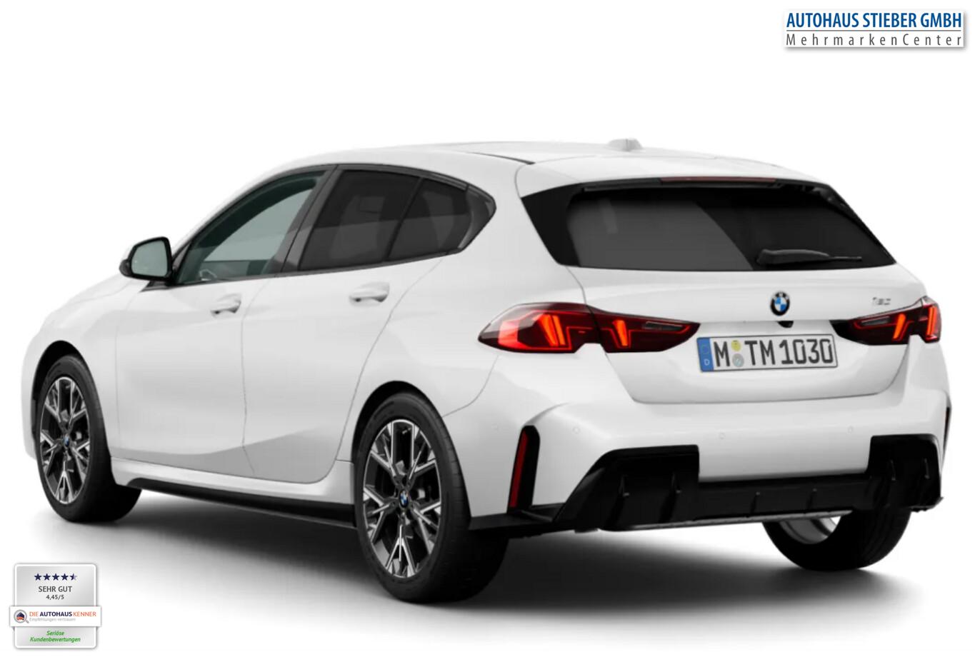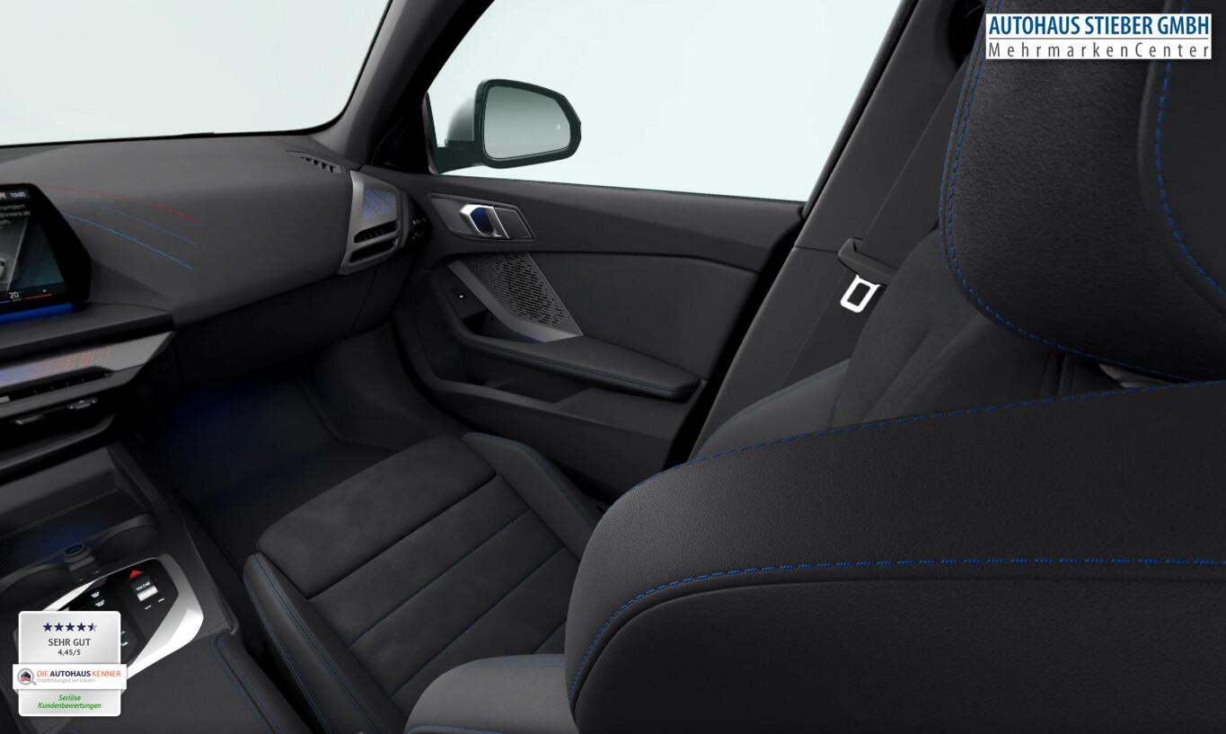 Sonnenschutzverglasung (hinten abgedunkelt), LM-Felgen 8x18 (Y-Speiche 975, Bicolor, Midnight Grey, glanzgedreht), Außenspiegel anklappbar, Dachzierleisten in Wagenfarbe, Einstiegsleisten Aluminiumeinleger mit Schriftzug ,,M", Fahrassistenz-System: Ausstiegswarnung, Fahrassistenz-System: Ausweichassistent, Fahrassistenz-System: Linksabbiegewarnung mit Bremsfunktion, Fahrassistenz-System: Spurverlassenswarnung mit aktiver Rückführung, Fahrassistenz-System: Verkehrszeichenerkennung, Getränkehalter vorn, Instrumententafel mit Kontrastnähten, Intelligent Personal Assistant, Interieur Lichtpaket, M Interieurdekore Illuminated Aluminium Hexacube, matt, M Kennzeichnung an den Seiten, Navigationssystem, Pedalauflagen in Edelstahloptik, Reifen 225/45 R18, Schadstoffarm nach Abgasnorm Euro 6e (EU6 EA), Motor 1,5 Ltr. - 115 kW Mild-Hybrid (Mild-Hybrid 125 kW (Motor 1,5 Ltr. - 115 kW)), Parkassistent-Paket (Fahrassistenz-System: Anhängerassistent / Fahrassistenz-System: Parken Anfahrüberwachung / Fahrassistenz-System: Rückfahr-Assistent / Fahrassistenz-System: Rückfahrhilfe Notbremsfunktion (Active PDC) / Rückfahrkamera / Fahrassistenz-System: Park-Assistent), Fahrassistenz-System: Driving Assistant (Fahrassistenz-System: Heckaufprall-Vermeidung (Prävention Heckkollision) / Fahrassistenz-System: Querverkehrs-Assistent / Fahrassistenz-System: Spurwechsel-Warnsystem), Aktive Motorhaube, Außenausstattung: Shadow-Line Hochglanz, BMW Live Cockpit Plus, Dachhimmel Anthrazit, Geschwindigkeits-Begrenzeranlage (Speed Limit Device), Karosserie: 5-türig, M Sport, Parkbremse elektrisch, Personalisierungssystem (BMW My Modes), Personalisierungssystem (Personal eSIM), Radioempfang digital (DAB+), Service-System: Gesetzlicher Notruf, Sitzbezug / Polsterung: M Alcantara / Veganza Kombination (Schwarz mit blau Kontraststeppung), Multimedia-Schnittstelle 2 x USB (Typ C) Mittelkonsole vorn, Anti-Blockier-System (ABS), Bremsassistent, Fahrassistenz-System: Active Guard (Bremsassistent), Adaptives Fahrwerk M-Technic, Getriebe 7-Gang - Doppelkupplungsgetriebe mit Steptronic und Schaltwippen, Klimaautomatik, Airbag Beifahrerseite abschaltbar, Airbag Fahrer-/Beifahrerseite, Armauflage vorn, Fensterheber elektrisch, Isofix-Aufnahmen für Kindersitz an Beifahrersitz, Isofix-Aufnahmen für Kindersitz an Rücksitz, Sitzheizung vorn, Sportsitze vorn, Zentralverriegelung mit Fernbedienung, Geschwindigkeits-Regelanlage mit Bremsfunktion, Service-System: Intelligenter Notruf inkl. TeleServices, Lenkrad (Leder) mit Multifunktion M-Technic, Servolenkung Servotronic, Licht- und Regensensor, Lichtassistent (Follow me home), Scheinwerfer LED, Fahrassistenz-System: Aufmerksamkeits-Assistent, Fahrassistenz-System: Performance Control, Reifendruck-Kontrollsystem