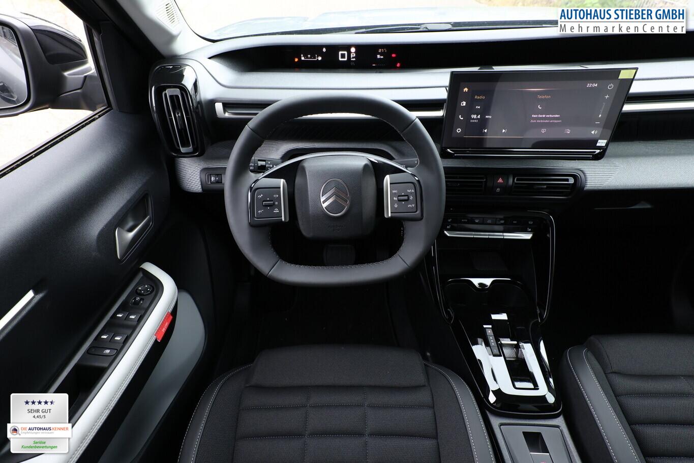 Innenausstattung: Ambiente Metropolitan Grey (Lenkrad heizbar / Sitzheizung vorn / Frontscheibe heizbar / Nebelscheinwerfer LED / Winter-Paket), Anti-Blockier-System (ABS), Audiosystem inkl. 10"-Touchscreen, 6 Lautsprecher, USB-Schnittstelle (Typ C), Elektron. Stabilitäts-Programm (ESP), Fahrassistenz-System: Spurassistent (AFIL), Gepäckraumbeleuchtung, Geschwindigkeits-Regelanlage (Tempomat) inkl. Geschwindigkeits-Begrenzeranlage, Innenraumbeleuchtung LED, Kartentasche an den Rückseiten der Vordersitze, Kindersicherung manuell, Lenkrad mit Multifunktion, Navigation in Verbindung mit dem Smartphone (über Apple Carplay / Android Auto /...), Radioempfang digital (DAB), Reifen 215/60 R17, Schadstoffarm nach Abgasnorm Euro 6e (EU6 EA), Servolenkung, Sitzbezug / Polsterung: Stoff/Kunstleder, Smartphone-Schnittstelle (Apple CarPlay & Android Auto), Verzurrösen im Gepäckraum, Fahrassistenz-System: Automatische Fahrlichtschaltung inkl. Fernlichtassistent (Einschaltautomatik für Fahrlicht), Einparkhilfe hinten inkl. Rückfahrkamera (Rückfahrkamera), Citroen Advanced Comfort Sitze, Heckscheibe heizbar, Heckscheibenwischer, Karosserie: 5-türig, Lenksäule (Lenkrad) mech. höhen-/längsverstellbar, Mild-Hybrid 100 kW (Motor 1,2 Ltr. - 100 kW), Otto-Partikelfilter (GPF), Parkbremse elektrisch, Radstand 2670 mm, Sitz vorn links höhenverstellbar, Stahlfelgen 7x17, Steckdose (12V-Anschluß) in Mittelkonsole vorn, Antriebsart: Frontantrieb, Getriebe Automatik - Doppelkupplungsgetriebe (6-Stufen, Hybrid), Klimaautomatik, Airbag Beifahrerseite abschaltbar, Airbag Fahrer-/Beifahrerseite, Kopf-Airbag-System und Seitenairbag, Fensterheber elektrisch hinten, Fensterheber elektrisch vorn, Isofix-Aufnahmen für Kindersitz an Rücksitz, Rücksitzlehne geteilt/klappbar 1/3-2/3, Seitenscheiben hinten und Heckscheibe dunkel getönt, Zentralverriegelung mit Fernbedienung, Head-up-Display, Dachreling schwarz, Fahrassistenz-System: Verkehrszeichenerkennung, Außenspiegel elektr. verstell-, heiz- und anklappbar, Scheibenwischer mit Regensensor, Scheinwerfer Eco-LED, Tagfahrlicht LED, Reifendruck-Kontrollsystem, Stop-Start-Anlage