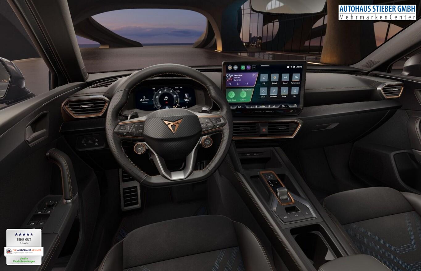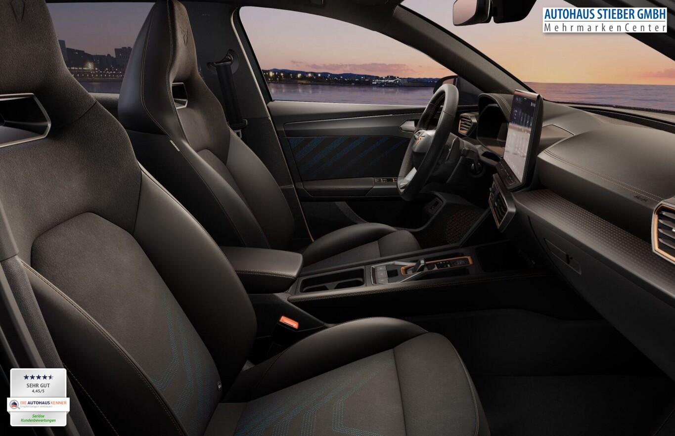 Design-Paket Dynamic (Lendenwirbelstütze Sitz vorn links, elektr. verstellbar / Sitzbezug / Polsterung: Stoff Dinamica / Kunstleder schwarz mit blauen Akzenten / Sitz vorn links elektr. verstellbar (mit Memory) / Sitzheizung vorn / Sport-Schalensitze vorn mit integrierten Kopfstützen / Außenspiegel elektr. verstell-, heiz- und anklappbar, Spiegelabsenkung, Welcome Light, Memory / Winter-Paket), Edge-Paket (Ambiente-Beleuchtung LED / Ambiente-Beleuchtung Smart Ambient Light / Schließ-/Startsystem Kessy Advanced / Heckklappe/-Deckel elektr. betätigt (öffnen + schliessen, sensorgesteuert) / Rückfahrkamera / Diebstahl-Warnanlage mit Innenraumüberwachung und Abschleppschutz), Seitenairbag hinten (Knieairbag Fahrerseite), Reserverad als Notrad, Ablagetaschen an Rückseite der Vordersitzlehnen, Antiblockiersystem (ABS), Bluetooth-Schnittstelle, Dachreling schwarz, Elektron. Stabilitäts-Programm (ESP), Fahrassistenz-System: Abbiegebremsfunktion und Ausweichunterstützung, Fahrassistenz-System: Kreuzungs-Assistent (Crossroad Assist), Freisprecheinrichtung Bluetooth, Geschwindigkeitsbegrenzer, Induktionsladeschale für Smartphone, Isofix-Aufnahmen für Kindersitz an Beifahrersitz und Rücksitz, Knieairbag Beifahrerseite, LM-Felgen 7,5x18 (Garbi), Mittelarmlehne hinten, Navigation in Verbindung mit dem Smartphone (über Apple Carplay / Android Auto /...), Ottopartikelfilter (OPF), Pedale Aluminium-Design, Rücksitzlehne geteilt/klappbar, Serviceintervall 30000 km oder 2 Jahre, Sommerreifen 225/40 R18, Sprachsteuerungs-System, Start-Stopp-System, Tagfahrlicht LED, Vorbereitung Navigationssystem, Waschwasserstandsanzeige, Licht- und Sicht-Paket (Innenspiegel mit Abblendautomatik / Einschaltautomatik für Fahrlicht / Licht- und Regensensor / Lichtassistent (Coming Home, Leaving Home)), Media-System Plus (Audiosystem mit 12,9" Touchscreen-Farbdisplay), Voll-LED-Paket (Leuchtweitenregelung automatisch / Heckleuchten Voll-LED mit dynamischem Lichtband (Infinite Light) / Nebelscheinwerfer LED mit Abbiegelicht / Scheinwerfer Voll-LED), 6 Lautsprecher, Einstiegsleisten vorn beleuchtet, Gepäck-/Laderaumboden doppelt, Gepäckraum-Abtrennung (Netz), Gepäckraumabdeckung / Rollo, Karosserie: 5-türig, Kombiinstrument digital (virtual cockpit), Kopfstützen hinten (3-fach), Leseleuchten hinten LED, Leseleuchten vorn LED, Mild-Hybrid 110 kW (Motor 1,5 Ltr. - 110 kW eTSI), Parkbremse elektrisch mit Auto-Hold-Funktion, Radioempfang digital (DAB+), Sitz vorn rechts höhenverstellbar, Sonnenblende links mit Spiegel (beleuchtet), Sonnenblende rechts mit Spiegel (beleuchtet), Steckdose 230V im Gepäckraum, Warnanlage für Sicherheitsgurt-System, Full Link (MirrorLink, Apple CarPlay und Android Auto), USB-Ladeanschlüsse (2-fach, Typ C) für 2.Sitzreihe, USB-Schnittstelle vorn (2-fach, Typ C), Antriebsart: Frontantrieb, Elektron. Differentialsperre (XDS), Getriebe 7-Gang - Doppelkupplungsgetriebe DSG, Klimaanlage Climatronic 3-Zonen, Airbag Beifahrerseite abschaltbar, Airbag Fahrer-/Beifahrerseite, Fensterheber elektrisch vorn + hinten mit Komfortschaltung, Kopf-Airbag-System, Mittelarmlehne vorn, Seitenairbag, Seitenairbag vorn mitte (Central Airbag), Seitenscheiben ab 2.Sitzreihe und Heckscheibe dunkel getönt (Privacy Glass), Fahrassistenz-System: Fahrprofilauswahl (CUPRA Drive Profile), Fahrassistenz-System: Automatische Distanzregelung (ACC), Fahrassistenz-System: Verkehrszeichenerkennung, Notrufsystem, Lenkrad heizbar (CUPRA Supersport, Leder) mit Multifunktion und Schaltfunktion, Progressivlenkung, Außenspiegel elektr. verstell-, heiz- und anklappbar mit Spiegelabsenkung und Welcome Light, Fahrassistenz-System: Fernlichtassistent, Einparkhilfe vorn und hinten, Fahrassistenz-System: Müdigkeitserkennung, Fahrassistenz-System: Spurhalteassistent, Fahrassistenz-System: Umfeldbeobachtungssystem (Front assist) mit City-Notbremsfunktion, Reifenkontroll-Anzeige