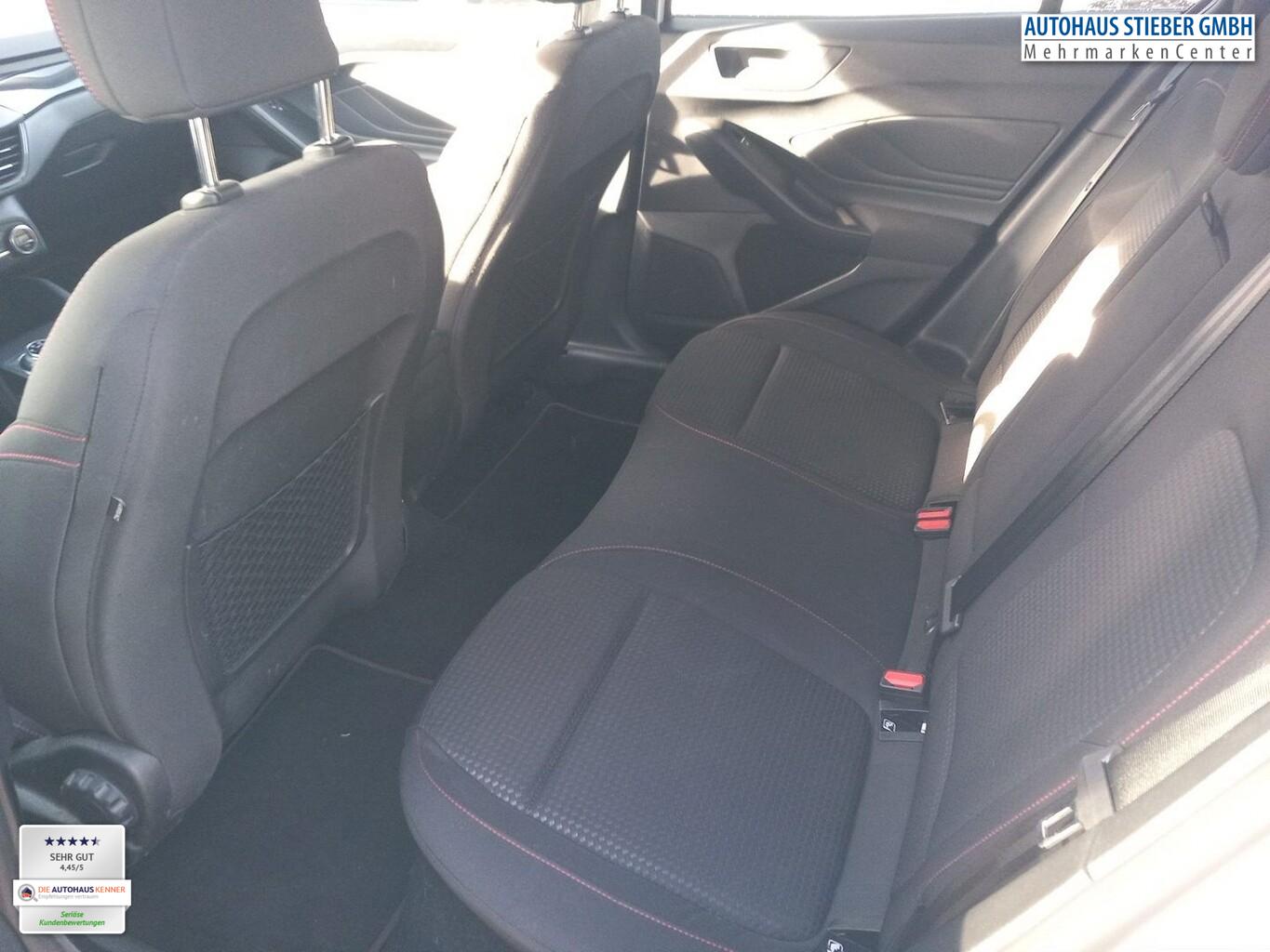 Kofferraumdeckel / Heckklappe elektr. betätigt (Öffnung, sensorgesteuert) (KeyFree-System / Power KeyFree-Startfunktion), Winter-Paket (Lenkrad heizbar / Sitzheizung vorn / Frontscheibe heizbar), 12,3" Farbdisplay auf der Instrumententafel, 3. Bremsleuchte, Adaptive Geschwindigkeitsregelanlage (Adaptive Cruise Control / ACC), Apple CarPlay, Android Auto, Bluetooth Freisprecheinrichtung, Bremssättel rot lackiert, Dachkonsole mit LED-Leuchten vorn und hinten, Dachspoiler, Einparkhilfe vorne und hinten, Fahrassistenz-System: Fahrmodusauswahl (Standard, Sport, Eco), Fahrassistenz-System: Fernlichtassistent, Fahrassistenz-System: Müdigkeitserkennung, Fahrassistenz-System: Spurzentrierassistent mit Stop & Go, Fahrassistenz-System: Verkehrszeichenerkennung, Fahrerairbag, Klimaautomatik 2-Zonen, Kniepolster an der Mittelkonsole mit roten Ziernähten, Kühlergrill im Waben Desgin, LED Nebelscheinwerfer mit Abbiegelicht, LED Scheinwerfer mit Halogen Fernlicht, Lenkrad (3-Speichen) mit Multifunktion, LM-Felgen 7x17 (5x2-Speichen), Navigationssystem mit SYNC 3.0, 8 "Farbdisplay, Radioempfang Digital (DAB+), Reifen 215/50 R17, Reifenreparatursatz, Rückbank mit Skiöffnung und faltbar Armlehne, Rückfahrkamera, Schadstoffarm nach Abgasnorm Euro 6d-ISC-FCM (EU6AP), Schalthebel aus Leder und Aluminium, Scheibenwischerautomatik mit Regensensor, Seitenfensterrahmen - Kunststofffarbe, Sportpedale, ST-Line Design an Vordertür, Stoßstange Oberteil in Wagenfarbe, Vordersitze im Sportstil, Zierstreifen am Armaturenbrett und an den Türen in Farbe "Carbon", FordPass Connect inkl. eCall (Fahrassistenz-System: Sicherheitssystem SYNC mit automatischem Notruf), Intelligenter Geschwindigkeits-Begrenzer (Geschwindigkeits-Begrenzeranlage), Mittelkonsole Premium (Getränkehalter vorn / Mittelarmlehne vorn mit Staufach und 12V-Anschluß), Sitz vorn links höhenverstellbar (Lendenwirbelstütze Sitz vorn links), Fahrassistenz-System: Pre-Collision-System (Fahrassistenz-System: Auffahrwarnsystem), Getriebe Automatik - Typ: 8F24 (8-Stufen) (Lenkrad mit Schaltwippen), Dachhimmel Stoff, dunkel, Dachspoiler Wagenfarbe, Karosserie: 5-türig, Motor 1,5 Ltr. - 134 kW EcoBoost KAT, Parkbremse elektrisch mit Auto-Hold-Funktion, Warnanlage für Sicherheitsgurte hinten, Warnanlage für Sicherheitsgurte vorn, Anti-Blockier-System (ABS), Antischlupfregelung (ASR), Elektron. Stabilitäts-Programm (ESP), Sport-Fahrwerk, Fensterheber elektrisch vorn + hinten mit Komfortschließung, My Key (2. Fahrzeugschlüssel programmierbar), Rücksitzlehne geteilt/klappbar (60:40), Zentralverriegelung mit Fernbedienung, Dachreling schwarz, Verglasung getönt, Lenkrad (Sport/Leder, ST), Servolenkung elektrisch, Außenspiegel elektr. verstell- und heizbar, Scheinwerfer-Assistent mit Tag-/Nachtsensor, Tagfahrlicht LED, Fahrassistenz-System: Spurhalteassistent, Reifendruck-Kontrollsystem