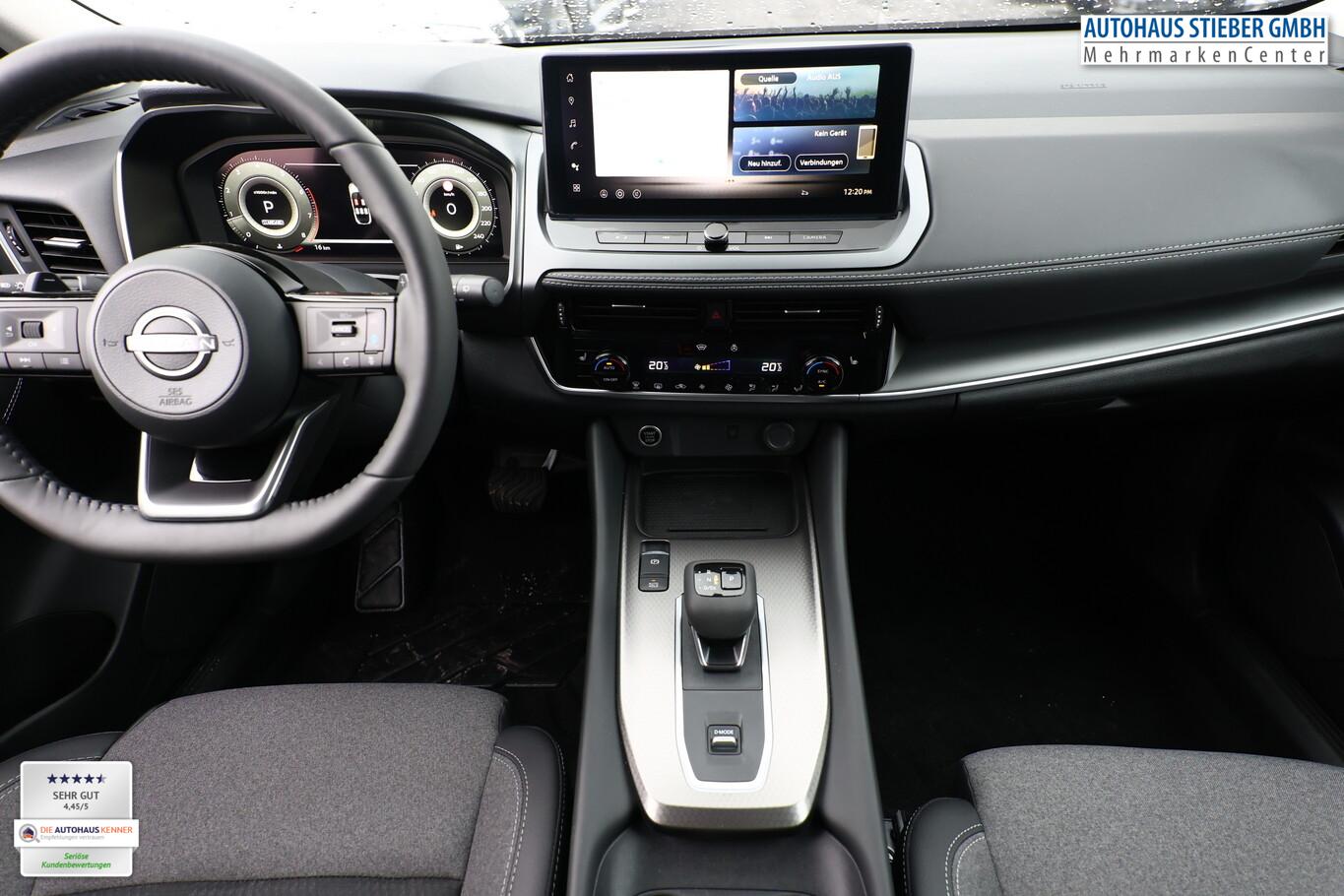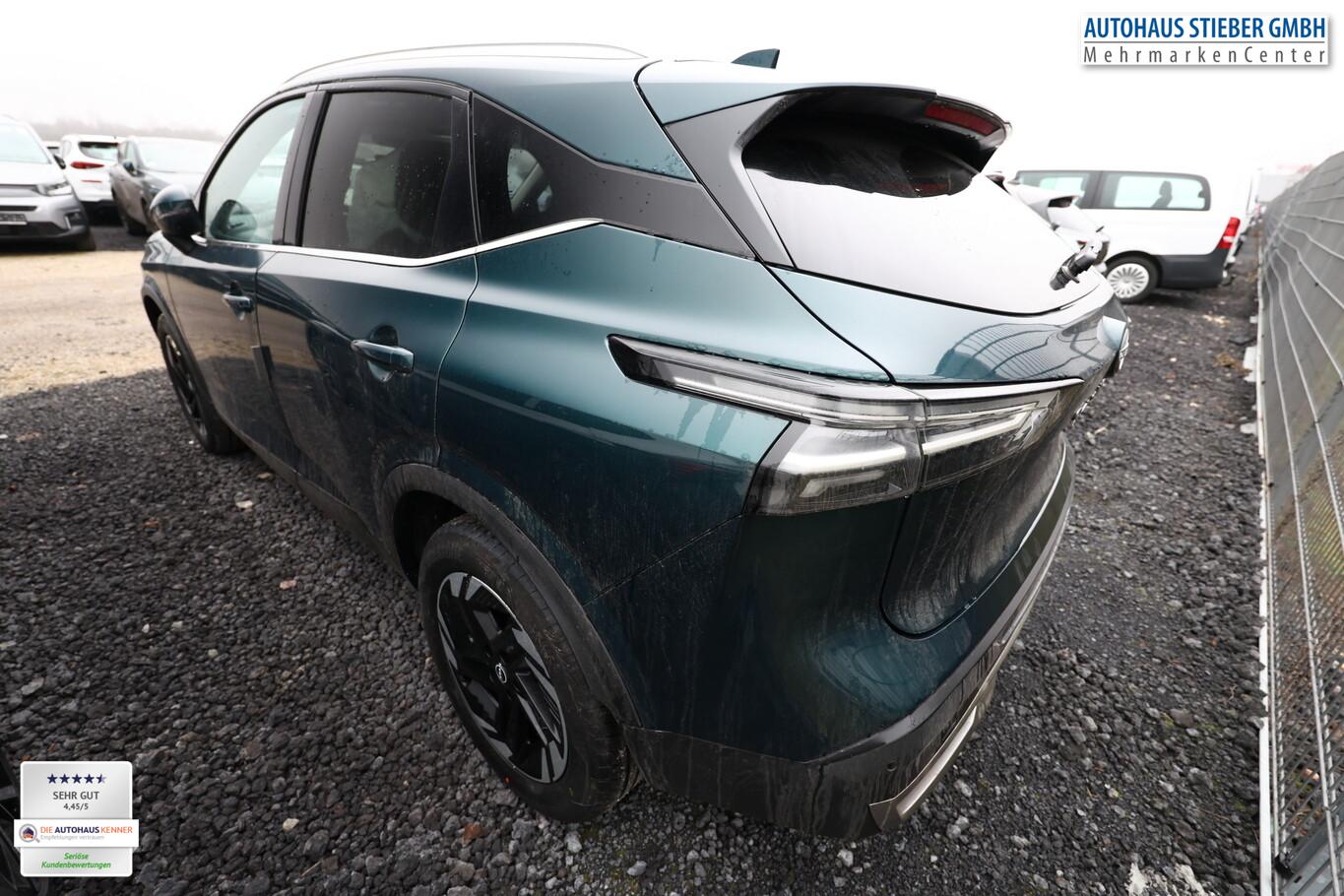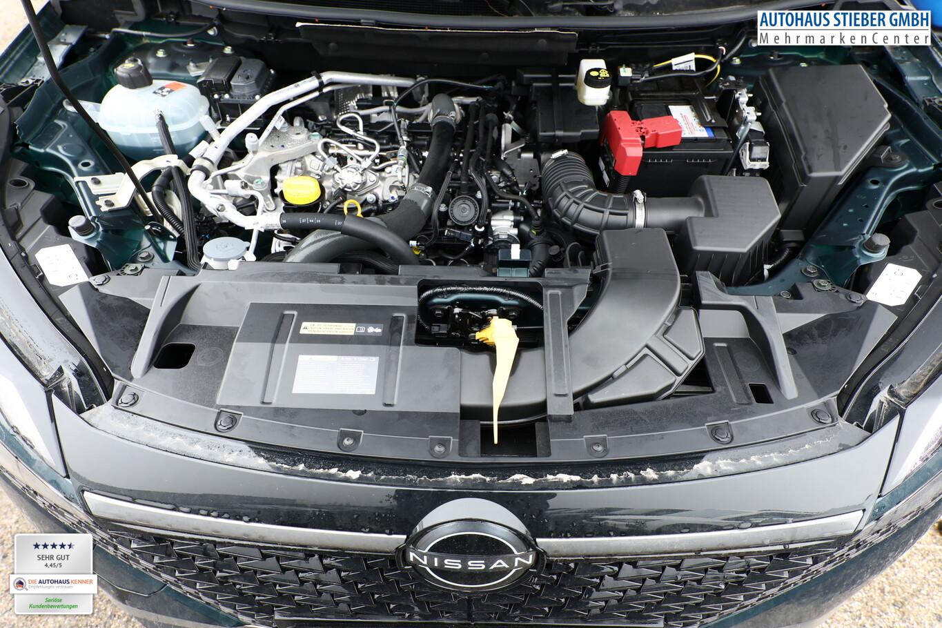 Winter-Paket (Lenkrad heizbar / Sitzheizung vorn / Frontscheibe heizbar), 6 Lautsprecher, Dachträger silber, Fahrassistenz-System: Bremsassistent, Fahrassistenz-System: Spurverlassenswarnung, Fahrassistenz-System: Stau-Pilot, Getränkehalter vorn, Induktionsladeschale für Smartphone, Lenkrad heizbar, LM-Felgen 18 Zoll, Nissan Herstellgarantie 3 Jahre / 100.000km, Radioempfang digital (DAB), Reifen 235/55 R18, Wegfahrsperre, Zentralverriegelung mit Fernbedienung, Ausstattungs-Paket: Nissan Connect Navigationssystem mit Around View Monitor (Smartphone kabellose Schnittstelle (Apple CarPlay & Android Auto) / Sprachbediensystem Spracherkennung / Kamerasystem Around View / Service-System: Google Services / Service-System: Nissan Connect Services / Einparkhilfe vorn und hinten), Schließ-/Startsystem intelligent key (Keyless-Entry / Start-Stop-Knopf), Lenkrad (Leder) mit Multifunktion (Audiobedienung am Lenkrad), Ambiente-Beleuchtung, Dachantenne im Haifischflossen-Design, Elektr. Bremskraftverteilung (EBD), Geschwindigkeits-Begrenzeranlage, Innenspiegel mit Abblendautomatik, Instrumentenanzeige TFT-Farbdisplay (12,3 Zoll), Karosserie: 5-türig, Kofferraumbeleuchtung, Lendenwirbelstütze Sitz vorn links, elektr. verstellbar, Lenksäule (Lenkrad) höhen-/längsverstellbar, Mild-Hybrid 116 kW (Motor 1,3 Ltr. - 116 kW DIG-T MHEV), Mittelarmlehne hinten mit Getränkehalter, Notbrems-Warnblinkautomatik, Parkbremse elektrisch, Schalt-/Wählhebelgriff Leder, Scheibenwischer mit Intervallschaltung, Sitz vorn links höhenverstellbar, Sitz vorn rechts höhenverstellbar, Sonnenblenden mit Spiegel (beleuchtet), Steckdose (12V-Anschluß) in Mittelkonsole, Touchscreen-Farbdisplay (12,3 Zoll), Navigationssystem, USB-Anschluss im Fond, USB-Schnittstelle, Anti-Blockier-System (ABS), Fahrassistenz-System: Moving Object Detection (MOD, Fußgängererkennung und bewegliche Objekterkennung), Antriebsart: Frontantrieb, Elektron. Stabilitäts-Programm (ESP), Getriebe Automatik stufenlos - X-Tronic-CVT, Klimaautomatik 2-Zonen, Airbag Fahrer-/Beifahrerseite, Fensterheber elektrisch vorn + hinten, Isofix-Aufnahmen für Kindersitz, Rücksitz geteilt/klappbar, Seitenairbag, Verglasung hinten abgedunkelt, Fahrmodusschalter, Around View Monitor (360° Umgebungsansicht), Auto-Hold-Funktion, Fahrassistenz-System: Auffahrwarnsystem (Forward Collision Warning, FCW), Fahrassistenz-System: Berganfahr-Assistent, Fahrassistenz-System: Verkehrszeichenerkennung, Geschwindigkeits-Regelanlage (Tempomat) mit Abstandsregelung, Fahrassistenz-System: Sicherheitssystem ERA GLONASS mit automatischem Notruf, Lenkrad mit Schaltwippen/-tasten, Außenspiegel elektr. anklappbar, Außenspiegel elektr. verstell- und heizbar, Automatische Fahrlichtschaltung, Fahrassistenz-System: Fernlichtassistent, Fahrassistenz-System: Totwinkel-Assistent, Heckleuchten LED, Scheibenwischer mit Regensensor, Scheinwerfer LED, Fahrassistenz-System: aktiver Spurhalteassistent, mit korrigierendem Bremseingriff, Fahrassistenz-System: Autonomer Notbrems-Assistent, Fahrassistenz-System: Müdigkeitserkennungs-Sensor, Fahrassistenz-System: Querverkehrs-Assistent Heck (Rear Cross Traffic Alert, RCTA), Reifendruck-Kontrollsystem, Start/Stop-Anlage