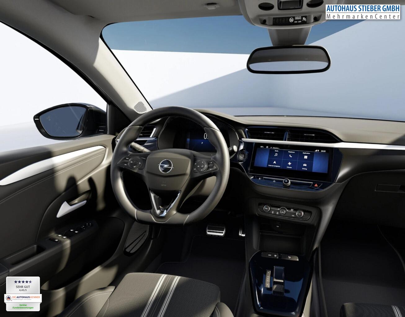 Infotainment-Paket (Ambiente-Beleuchtung LED / DAB-Tuner (Radioempfang digital) / Feststellbremse elektrisch / Induktionsladeschale für Smartphone (Wireless Charging) / Opel Connect / Technologie-Paket Park & Go Plus / Audio-Navigationssystem Multimedia Navi Pro (10" Display) / Smartphone Schnittstelle (Apple CarPlay & Android Auto) / USB-Schnittstelle hinten (2-fach) / Klimaautomatik / Mittelarmlehne vorn mit Ablagefach / Schließ-/Startsystem Keyless Open / Wärmeschutzverglasung hinten abgedunkelt (Solar-Protect) / Rückfahrkamera mit 180° Umgebungsansicht / Außenspiegel elektr. verstell- und heizbar / Außenspiegel elektr. verstell- und heizbar, elektr. anklappbar / Fahrassistenz-System: Totwinkel-Assistent / Parkpilotsystem hinten / Parkpilotsystem vorn und hinten), Komfort-Paket (Fahrassistenz-Paket: Active Drive Assist plus / Fahrzeugschlüssel (2) beide klappbar / Lenkrad heizbar / Sitzheizung vorn / Fahrassistenz-System: Verkehrszeichenerkennung, erweitert (Geschwindigkeits-Regel-/Begrenzeranlage) / Geschwindigkeits-Regelanlage (Tempomat) mit Abstandsregelung und Stopp-Funktion / Fahrassistenz-System: aktiver Spurhalteassistent (Lenkunterstützung) / Fahrassistenz-System: Autonomer Notbrems-Assistent mit Frontkollisionswarnung und Fußgänger- und Fahrraderkennung), Außenspiegel schwarz lackiert, Beifahrerairbag deaktivierbar, Blinkleuchten LED in Außenspiegel integriert, Bluetooth-Schnittstelle, Dachhimmel grau, Fahrassistenz-System: Autonomer Notbrems-Assistent mit Frontkollisionswarnung und Fußgänger- und Fahrraderkennung, Fahrassistenz-System: Fernlichtassistent, Fahrmodusschalter, Kombiinstrument digital (7 Zoll), Leseleuchten LED vorn und hinten, LM-Felgen 16 Zoll, Nebelscheinwerfer LED, Notrufsystem eCall, Reifen 195/55 R16, Reifendruck-Kontrollsystem, Scheinwerfer Matrix LED, Servolenkung, geschwindigkeitsabhängig, Sitz vorn links 6-fach verstellbar, Sitz vorn rechts 4-fach verstellbar, Sitzbezug / Polsterung: Kunstleder, Sonnenblenden mit Spiegel, Steckdose 12V vorn, Tagfahrlicht LED, USB-Schnittstelle vorn, Voll-LED (IntelliLux), Sicht-Paket (Innenspiegel mit Abblendautomatik / Einschaltautomatik für Fahrlicht / Scheibenwischer mit Regensensor), Geschwindigkeits-Regelanlage (Tempomat) inkl. Geschwindigkeits-Begrenzeranlage (Geschwindigkeits-Regelanlage (Tempomat)), 6 Lautsprecher, B-Säulen schwarz Hochglanz (außen), Gepäckraumbeleuchtung (LED), Karosserie: 5-türig, Lenksäule (Lenkrad) verstellbar, Mild-Hybrid 100 kW (Motor 1,2 Ltr. - 100 kW), Otto-Partikelfilter (OPF), Pedale Aluminium, Türgriffe außen Wagenfarbe, Warnanlage für Sicherheitsgurt, Beifahrerseite, Warnanlage für Sicherheitsgurt, Fahrerseite, Warnanlage für Sicherheitsgurte hinten, Anti-Blockier-System (ABS), Elektron. Stabilitäts-Programm Plus (ESP), Getriebe Automatik - Doppelkupplungsgetriebe (6-Stufen, Hybrid), Airbag Fahrer-/Beifahrerseite, Fensterheber elektrisch vorn + hinten, Isofix-Aufnahmen für Kindersitz an Beifahrersitz, Isofix-Aufnahmen für Kindersitz an Rücksitz, Kopf-Airbag-System, Rücksitzbank geteilt/klappbar (60:40), Seitenairbag vorn, Fahrassistenz-System: Berganfahr-Assistent (HSA, Hill Start Assist), Fahrassistenz-System: Verkehrszeichenerkennung, Lenkrad (Leder, vegan) mit Multifunktion, Heckleuchten LED, Fahrassistenz-System: Müdigkeitserkennungs-Sensor, Fahrassistenz-System: Spurhalteassistent