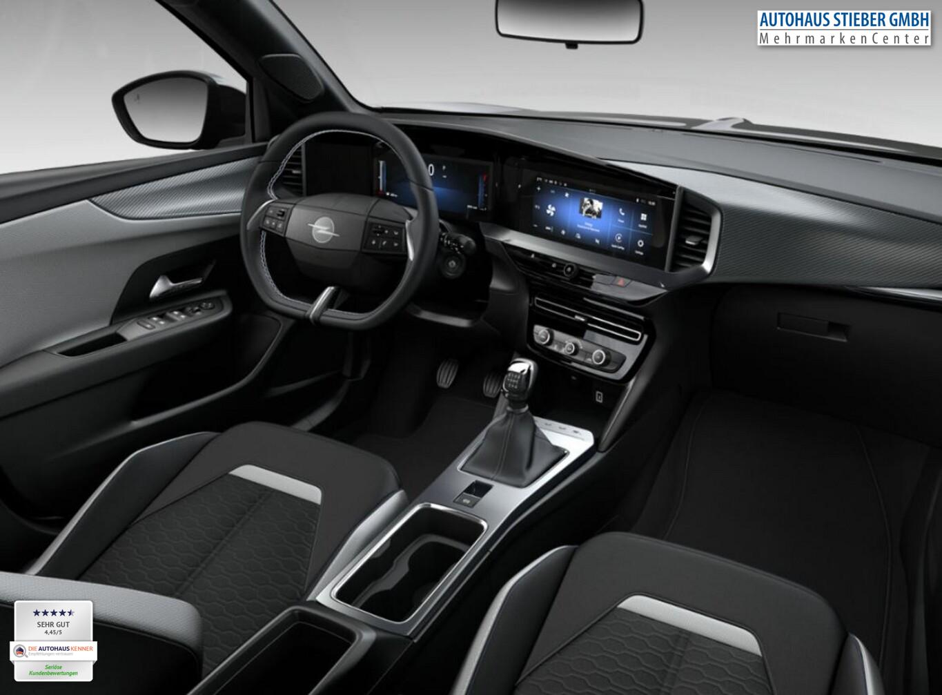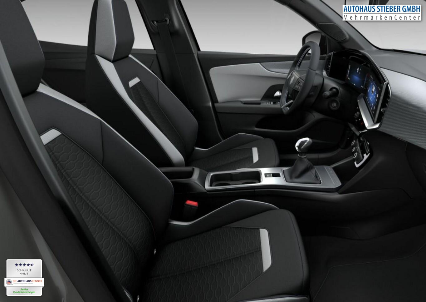 Winter-Paket (Lenkrad heizbar / Sitzheizung vorn), Airbag Fahrer-/Beifahrerseite, Außenspiegel elektr. verstell- und heizbar, elektr. anklappbar, Außenspiegelgehäuse in Schwarz, Beifahrersitz 4-fach manuell einstellbar, Einparkhilfe vorn und hinten, Fahrassistenz-System: Autonomer Notbremsassistent, Fahrassistenz-System: Berganfahrassistent, Fahrassistenz-System: Spurhalteassistent, Fahrassistenz-System: Totwinkel-Assistent, Fahrersitz 6-fach manuell einstellbar, Fensterheber elektr. vorn + hinten, Geschwindigkeits-Begrenzeranlage, Geschwindigkeits-Regelanlage (Tempomat), Isofix-Aufnahmen für Kindersitz, Kabellose Smartphone-Schnittstelle (Apple CarPlay & Android Auto), Klimaautomatik, Kombiinstrument digital (10"), Lenkrad (Kunstleder, 3-Speichen), Leseleuchten vorn und hinten, Multimedia Infotainment inkl. 10"-Touchscreen, 6 Lautsprecher, Navigation in Verbindung mit dem Smartphone (über Apple Carplay / Android Auto /...), Notrufsystem, Opel Blitz vorne in Silber, hinten und Modellname hinten in Schwarz, Reifendruckkontrollsystem, Rückfahrkamera mit 180° Umgebungsansicht, Rücksitzlehne geteilt/umklappbar (60:40), Scheibenwischer mit Regesensor, Schlüsselloses Startsystem "Keyless Open & Start", Servolenkung (elektrisch), Sommerreifen 215/65 R16, Sonnenblenden mit Spiegel, Start/Stopp System, Tech-Paket 2, USB-Anschluss (Typ C), Zentralverriegelung mit Fernbedienung, Bluetooth Audio-Streaming, DAB-Tuner (Radioempfang digital), Dach Wagenfarbe, Dachhimmel schwarz, Dachspoiler, Feststellbremse elektrisch, Karosserie: 5-türig, Motor 1,2 Ltr. - 100 kW, Otto-Partikelfilter (OPF), Radstand 2557 mm, Sitzbezug / Polsterung: Stoff, Stahlfelgen 6,5x16, Freisprecheinrichtung Bluetooth, Anti-Blockier-System (ABS), Antriebsart: Frontantrieb, Elektron. Stabilitäts-Programm Plus (ESP), Getriebe 6-Gang, Kopf-Airbag-System, Seitenairbag vorn, Fahrassistenz-System: Verkehrszeichenerkennung, Einschaltautomatik für Fahrlicht, Fahrassistenz-System: Fernlichtassistent, Heckleuchten LED, Scheinwerfer LED, Tagfahrlicht LED, Fahrassistenz-System: Müdigkeitserkennungs-Sensor