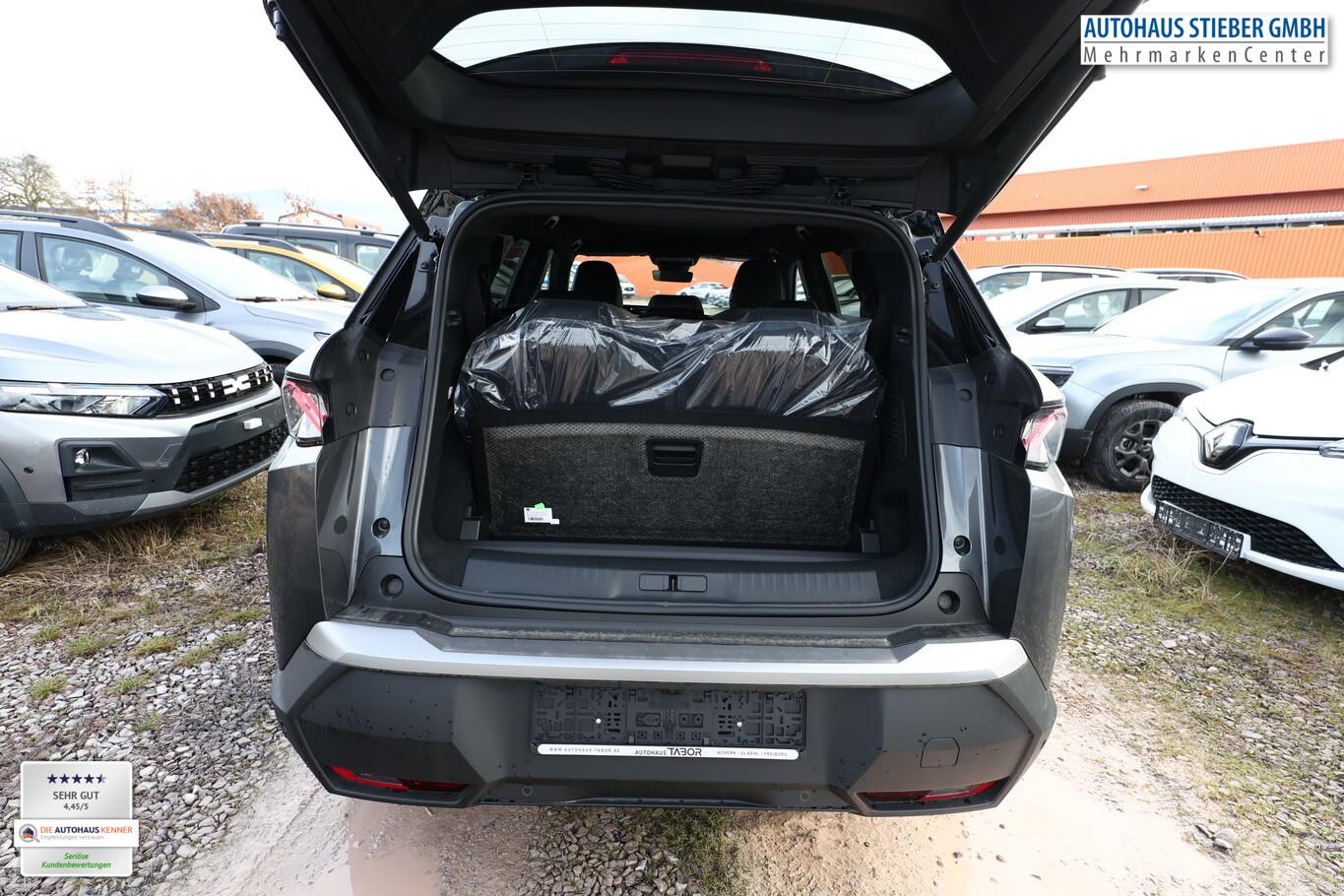 Komfort-Paket (Innenausstattung: Ziernähte farbig / Komfortsitze vorn / Lendenwirbelstütze Sitz vorn links und rechts, elektr. verstellbar / Sitzbezug / Polsterung: Alcantara / Kunstleder / Sitze vorn mit ausziehbarer Oberschenkelauflage / Sitze vorn mit Massagefunktion / Sitz vorn links elektr. verstellbar (mit Memory) / Sitzheizung hinten), Anhängerkupplung (Kugelkopf senkrecht demontierbar, Ausführung verbessert), 21"-Panoramadisplay, 3. Sitzreihe klappbar, 6 Lautsprecher, Ambientenbeleuchtung, Audiobedienung am Lenkrad, Dachreling schwarz, Einparkhilfe vorn, Fahrmodusschalter, Fensterheber elektr. hinten, Fensterzierleisten schwarz, Freisprecheinrichtung Bluetooth, Handschuhfach beleuchtet, Lenkrad (Leder), LM-Felgen 19 Zoll, Navigationssystem i-Connect Advanced, Radioempfang digital (DAB+), Reifen 225/55 R19, Schadstoffarm nach Abgasnorm Euro 6e (EU6 EA), Schiebe-/Hebedach elektrisch (Glas), Smartphone Schnittstelle kabellos (Apple Car Play/Android Auto), USB-Anschluss, Außenspiegel und Spiegelfuss in Perla-Nera-Schwarz, Dachfarbe schwarz, Dachhimmel schwarz, Gepäckraumboden verschiebbar, variabel, Getränkehalter vorn, Innenspiegel mit Abblendautomatik, Karosserie: 5-türig, Lenkrad heizbar, Mittelarmlehne hinten, Mobile Online Dienste Mirror Screen, Otto-Partikelfilter (GPF), Parkbremse elektrisch, Pedale Aluminium, Radstand Standard, Sitze vorn höhenverstellbar, Sonnenblenden mit Make-up-Spiegel, Steckdose (12V-Anschluß) im Koffer-/Laderaum, Warnanlage für Sicherheitsgurte, Anti-Blockier-System (ABS), Fahrassistenz-System: Aktiver Notbrems-Assistent (Active Safety Brake Plus), Antriebsart: Frontantrieb, Elektron. Stabilitäts-Programm (ESP, Bosch), Getriebe Automatik - Doppelkupplungsgetriebe (6-Stufen, Hybrid), Klimaautomatik, getrennt regelbar Fahrer-/Beifahrerseite, Airbag Beifahrerseite abschaltbar, Airbag Fahrer-/Beifahrerseite, Fensterheber elektr. vorn, links mit Impulsgeber, Isofix-Aufnahmen für Kindersitz, Kopf-Airbag-System, Kopf-Airbag-System hinten, Mittelarmlehne vorn, Rücksitzbank geteilt/klappbar automatisch (40:20:40), Seitenairbag vorn, Seitenscheiben hinten und Heckscheibe getönt, Sitzheizung vorn, Zentralverriegelung / Startanlage Keyless System, Zentralverriegelung mit Fernbedienung, Kofferraumdeckel / Heckklappe elektr. betätigt (öffnen + schliessen, sensorgesteuert), Fahrassistenz-System: Autom. Distanzregelung (ACC inkl. Stop&Go-Funktion), Fahrassistenz-System: Berganfahrhilfe, Fahrassistenz-System: Verkehrszeichenerkennung, Rückfahrkamera mit 180° Umgebungsansicht, Peugeot Connect-Box / SOS-Taste (Notruf für Lokalisierung Fahrzeug), Lenkrad mit Multifunktion, Lenkrad mit Schaltwippen/-tasten, Servolenkung elektrisch, Außenspiegel elektr. anklappbar, Außenspiegel elektr. verstell- und heizbar, beide, Außenspiegel mit Umfeldleuchte, Einschaltautomatik für Fahrlicht, Fahrassistenz-System: Fernlichtassistent, Scheibenwischer mit Regensensor, Scheinwerfer Full-LED, Tagfahrlicht LED, Einparkhilfe hinten, Fahrassistenz-System: aktiver Spurassistent (Lenkunterstützung), Fahrassistenz-System: Müdigkeitserkennungs-Sensor, Reifendruck-Kontrollsystem