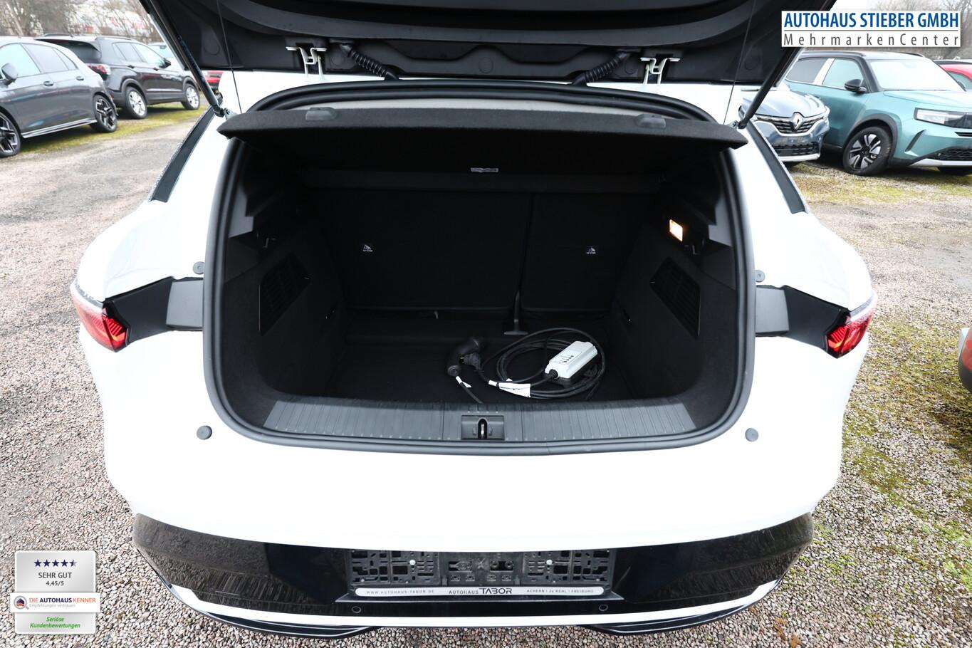 Winter-Komfort-Paket (Lendenwirbelstütze Sitz vorn links, elektr. verstellbar / Lenkrad heizbar / Sitz vorn links höhenverstellbar / Sitzheizung vorn / Lenkrad (Leder)), Ladekabel mit Schukostecker (Mode 2), Lackierung Arktis-Weiß, Einparkhilfe vorne und hinten, Fensterheber elektr. vorn und hinten, LM-Felgen 18 Zoll, Navigation in Verbindung mit dem Smartphone (über Apple CarPlay / Android Auto /...), Reifen 195/60 R18, Rückfahrkamera, Infotainment-System: OpenR link (9" Touchscreen, Arkamys Classic Sound, DAB+) (4 Lautsprecher / Smartphone Schnittstelle (Apple CarPlay & Android Auto)), Geschwindigkeits-Regelanlage (Tempomat) mit Verkehrszeichenerkennung (Geschwindigkeits-Begrenzeranlage / Adaptive Geschwindigkeitsregelanlage (ACC)), 3-Punkt-Sicherheitsgurt hinten, Außenspiegel Wagenfarbe, Elektromotor 160 kW (cont. 55 kW), Geräuschsimulator (Außensound), Heckscheibe heizbar, HV-Batterie 60 kWh, Innenausstattung: Stoff, grau, Innenspiegel abblendbar, Karosserie: 5-türig, Kombiinstrument digital, Kopfstützen hinten, Ladekabel mit Typ2/Typ2 (Mode 3), Reifen-Reparaturkit, Schnellladefunktion 130 kW (DC), Sitzbezug / Polsterung: Stoff, Anthrazit, Wärmepumpe für Heizungs-/Klimaanlage, Warnanlage für Sicherheitsgurte, USB-Anschlüsse (Typ C) Mittelkonsole vorn, Anti-Blockier-System (ABS), Fahrassistenz-System: Aktiver Notbrems-Assistent, Fahrassistenz-System: Fußgängererkennung, Elektron. Stabilitäts-Programm (ESP), Getriebe für Elektrofahrzeug, Klimaanlage, Airbag Beifahrerseite abschaltbar, Airbag Fahrer-/Beifahrerseite, Isofix-Aufnahmen für Kindersitz, Rücksitzbank geteilt/klappbar (1/3-2/3), Seitenairbag vorn, Zentralverriegelung / Startanlage Handsfree Entry & Drive, Zentralverriegelung mit Fernbedienung, Fahrassistenz-System: Abstandswarner, Fahrassistenz-System: Berganfahr-Assistent (HSA), Fahrassistenz-System: Verkehrszeichenerkennung, Fahrassistenz-System: Sicherheitssystem mit automatischem Notruf (ERA GLONASS / eCall), Lenkrad mit Schaltwippen/-tasten, Außenspiegel elektr. verstell- und heizbar, Einschaltautomatik für Fahrlicht, Nebelscheinwerfer, Scheinwerfer Full-LED mit LED-Signatur (Pure Vision), Tagfahrlicht LED, Fahrassistenz-System: Müdigkeitserkennungs-Sensor, Fahrassistenz-System: Spurhalteassistent Aktiv, Reifendruck-Kontrollsystem