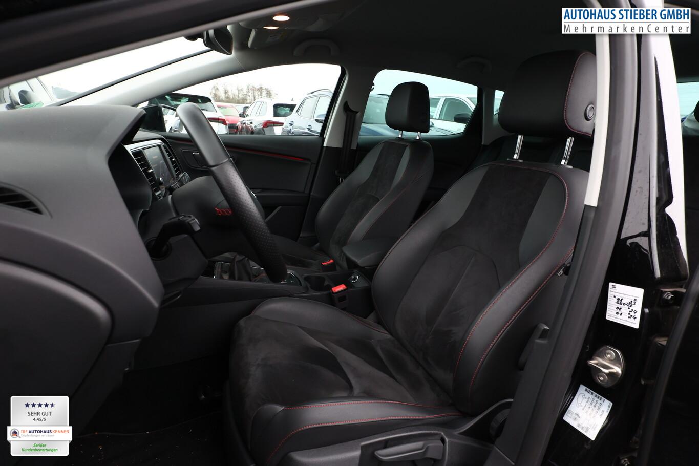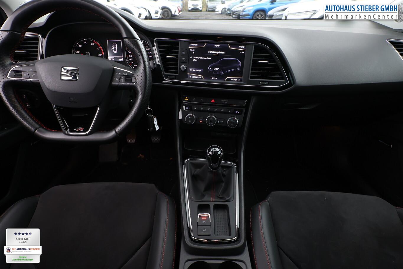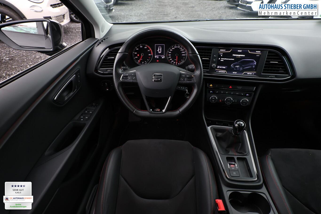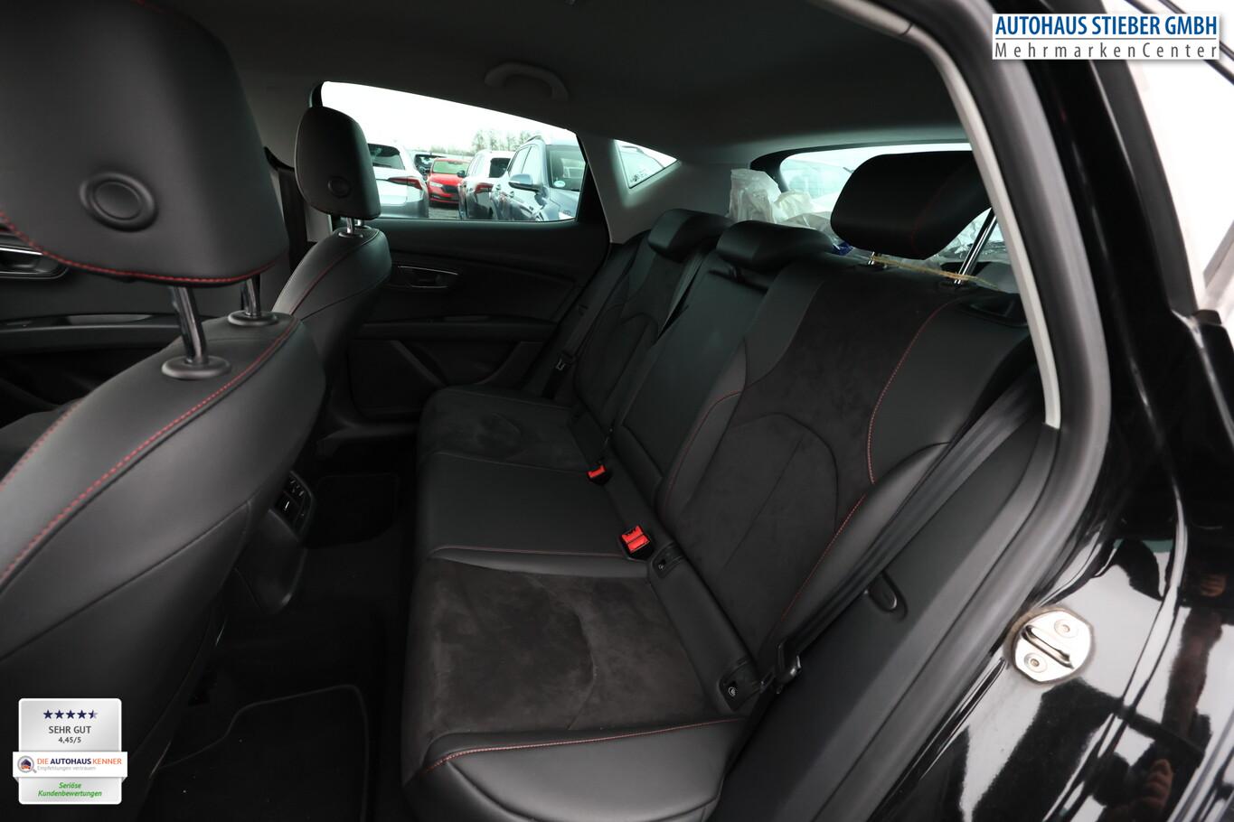 Scheinwerfer LED (Kennzeichenbeleuchtung LED / Heckleuchten LED), Alcantara-Paket (Lendenwirbelstütze Sitz vorn rechts, verstellbar / Sitzbezug / Polsterung: Leder / Alcantara / Sportsitze vorn), Metallic-Lackierung, Einparkhilfe vorn und hinten, optisch, LM-Felgen 7,5x18 (Performance), Diebstahl-Warnanlage mit Innenraumüberwachung und Abschleppschutz, Rückfahrkamera, Radioempfang digital (DAB), Mobile Online Dienste Full Link, Sicherheits-Paket (Fahrassistenz-System: Müdigkeitserkennung), Außenspiegel lackiert, Reserverad als Notrad, Außenspiegel rechts und links, konvex, automatische Leuchtweitenregulierung, Fußraumbeleuchtung vorn und hinten, Gepäckraumabdeckung, Heckscheibenwischer, Innenspiegel mit Abblendautomatik, Leseleuchten vorn und hinten, Lichtassistent (Coming Home), Mittelarmlehne vorn, Navigation in Verbindung mit dem Smartphone (über Apple CarPlay, Android Auto...), Reifen 225/40 R18, Scheibenwaschdüsen heizbar, Scheibenwischer mit Regensensor, Scheinwerfer-Reinigungsanlage (SRA), Service-/Wartungsintervall 2 Jahre / 30.000 Km, Sitzheizung vorn, Sound-System SEAT inkl. 10 Lautsprecher, Warnanlage für Sicherheitsgurte, Waschwasser-Standanzeige, SEAT Media-System Plus (8 Lautsprecher / iPod-Anschluss / Sprachsteuerungs-System / Lenkrad mit Multifunktion), Stau-/Ablagefach unter Sitze vorn (Stau-/Ablagefach unter Sitz vorn links), Außenspiegel elektr. anklappbar (Außenspiegel elektr. verstellbar (mit Memory)), Ablagetasche an Vordersitzlehnen, Außenspiegel und Türgriffe außen in Wagenfarbe, Außentemperaturanzeige, Innenausstattung: Chrom-Applikationen, Karosserie: 5-türig, Kopfstützen hinten (3-fach), Kopfstützen vorn verstellbar, Lendenwirbelstütze Sitz vorn links, verstellbar, Mittelkonsole vorn mit Mittelarmlehne, Becherhalter, Ablagebox und Luftausströmer hinten, Modellpflege, Motor 1,4 Ltr. - 110 kW 16V TSI ACT, Parkbremse elektrisch, Schadstoffarm nach Abgasnorm Euro 6, Schalt-/Wählhebelgriff Leder, Sitz vorn links höhenverstellbar, Sitz vorn rechts höhenverstellbar, Sonnenblende links mit Spiegel (beleuchtet), Sonnenblende rechts mit Spiegel (beleuchtet), Stoßfänger lackiert, AUX-IN-Anschluss und 2 x USB-Anschluss, Anti-Blockier-System (ABS), Bremsassistent, Antriebs-Schlupfregelung (ASR), Elektron. Differentialsperre (EDS), Elektron. Stabilitäts-Programm (ESP), Elektron. Stabilitätskontrolle (ESC), Sport-Fahrwerk FR / Cupra, Getriebe 6-Gang, Klimaanlage Climatronic 2-Zonen, Airbag Beifahrerseite abschaltbar, Airbag Fahrer-/Beifahrerseite, Fensterheber elektrisch hinten, Fensterheber elektrisch vorn, Isofix-Aufnahmen für Kindersitz, Knieairbag Fahrerseite, Kopf-Airbag-System, Rücksitzlehne geteilt/klappbar (1/3-2/3), Seitenairbag, Seitenscheiben hinten und Heckscheibe abgedunkelt, Zentralverriegelung mit Fernbedienung, Bordcomputer, Fahrassistenz-System: Fahrprofilauswahl (SEAT Drive Profile), Wärmeschutzverglasung, Geschwindigkeits-Regelanlage (Tempomat), Lenkrad (Sport/Leder), Servolenkung elektronisch gesteuert (Servotronic), Außenspiegel elektr. verstell-, heiz- und anklappbar, beide, Außenspiegel mit Spiegelabsenkung, rechts, Blinkleuchten LED in Außenspiegel integriert, Nebelscheinwerfer mit Abbiegelicht integriert, Tagfahrlicht, Reifenkontroll-Anzeige, Rußpartikelfilter, Start/Stop-Anlage