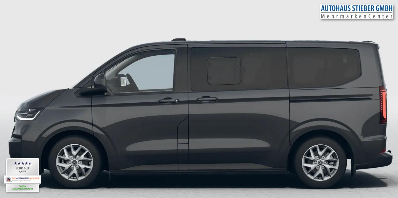 Fenster im Lade-/FG-Raum: - ausstellbar, vorn links, Fenster im Lade-/FG-Raum: - ausstellbar, vorn rechts, 10 Lautsprecher, 12V-Steckdose an D-Säule rechts, 12V-Steckdose in der Mittelkonsole, 2 Verzurrösen, 2. Reihe mit 3 Einzelsitzen, 3. Reihe mit 3er-Sitzbank, Rückenlehne klappbar, Airbag Fahrer-/Beifahrerseite, Beifahrerairbag abschaltbar, Anhängevorrichtung elektrisch anklappbar, Armlehnen vorn, Audio-Navigationssystem mit Touchscreen-Farbdisplay 13" inkl. App-Connect Wireless (Apple CarPlay / Android Auto), Außenspiegel elektr. verstell-, heiz- und anklappbar, Einparkhilfe vorn und hinten, Einstiegleisten Schiebetüren Metall, beleuchtet, Elektron. Stabilitäts-Programm (ESP), Fahrassistenz-System: Geschwindigkeits-Regelanlage mit Intelligentem Geschwindigkeits-Assistent, Fahrassistenz-System: Notbrems-Assistent, Fußgänger- und Fahrraderkennung, Ausweichunterstützung und Abbiege-Assistent, Handschuhfach beleuchtet, Kombiinstrument digital, Kraftstofftank 70 l Fassungsvermögen, Lenkrad (Kunstleder) mit Multifunktion, LM-Felgen 6,5x17 (Le Mans, silber), Notrufsystem eCall, Reifen 215/60 R17, Rückfahrkamera, Schadstoffarm nach Abgasnorm Euro 6e (EU6 EB), Schmutzfänger vorn und hinten, Seitenairbag / Kopfairbag (Curtain-Airbag) vorn und Kopfairbag (Curtain-Airbag) hinten, Sicherheitsinnenspiegel, manuell abblendbar, Sitzbezug / Polsterung: Kunstleder, Sitze vorn mit Lendenwirbelstütze, verstellbar, Sitze vorn verstellbar (6-fach), Sitzheizung vorn, Sonnenschutzrollos an den Seitenfenstern (2. Reihe), Startanlage / Zentralverriegelung Keyless Access ohne Safesicherung, Stoßfänger vorn und hinten in Wagenfarbe, USB-Schnittstellen vorn und hinten, Wegfahrsperre (elektronisch), Heckscheibe heizbar, Karosserie/Aufbau: Bus, Motor 2,0 Ltr. - 110 kW TDI, Schiebetüren Lade-/Fahrgastraum links/rechts inkl. Zuziehhilfe, Antriebsart: Frontantrieb, Getriebe 6-Gang, Klimaanlage Fahrerhaus und Fahrgastraum (3-Zonen mit autom. Regelung) mit Digitales Bedienteil im Fahrgastraum, Zusatzheizung elektrisch, Verglasung hinten abgedunkelt, Fahrassistenz-System: Verkehrszeichenerkennung mit Falschfahrer-Warnfunktion, Fahrassistenz-System: Dynamische Fernlichtregulierung (Dynamic Light Assist), Heckleuchten LED mit exklusiver Lichtsignatur, Matrix-LED-Scheinwerfer (IQ.Light) inkl. Coming- und Leaving-Home, Fahrassistenz-System: Spurhalteassistent (Lane Assist)